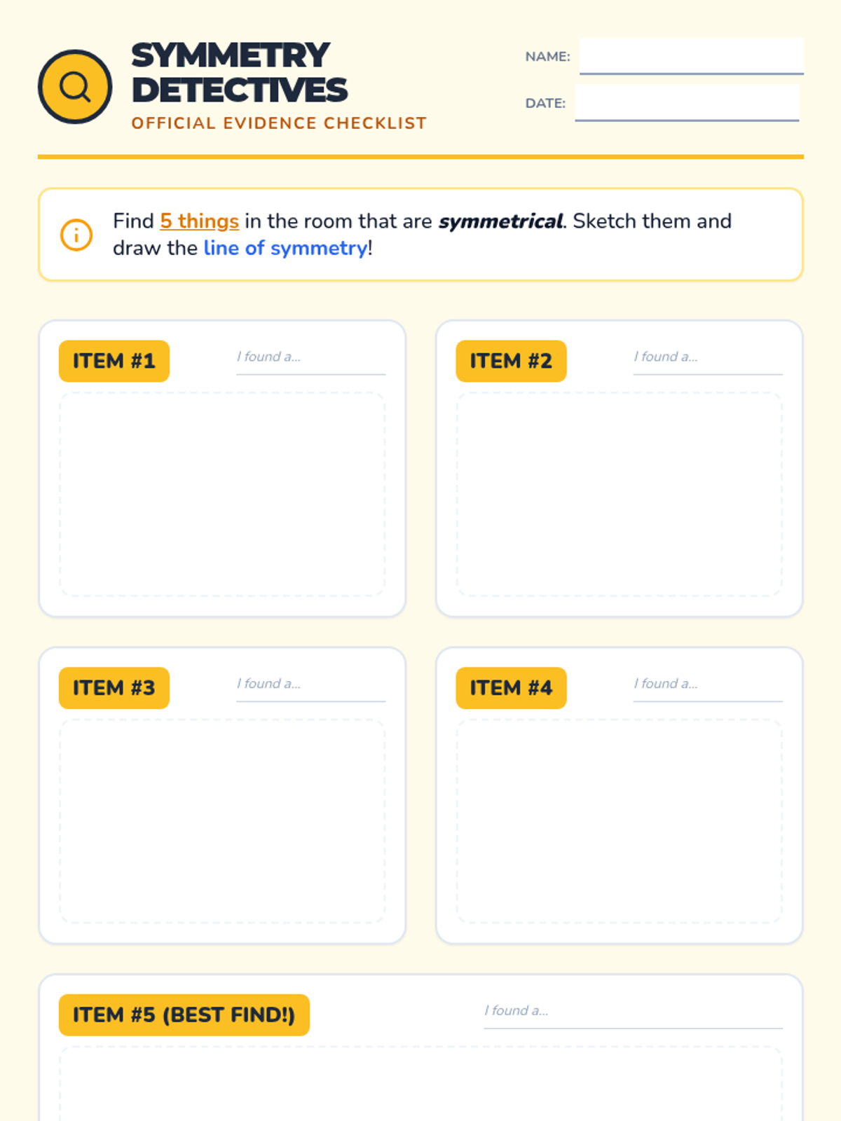 A student activity sheet for the Symmetry Detectives lesson, providing five large drawing spaces for students to sketch symmetrical classroom objects and their lines of symmetry.