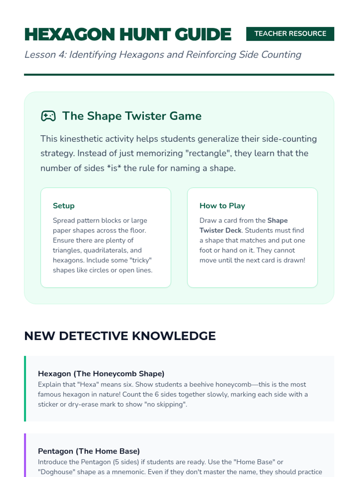 Teacher guidance for Lesson 4, focusing on hexagon identification strategies and facilitating the kinesthetic 'Shape Twister' game.