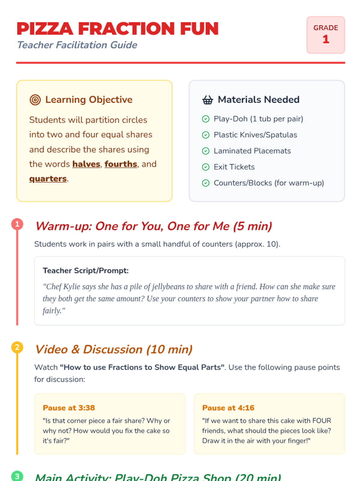 A comprehensive teacher guide for the 'Pizza Fraction Fun' lesson, including a warm-up activity, video discussion prompts, and a step-by-step Play-Doh activity guide for 1st-grade students.