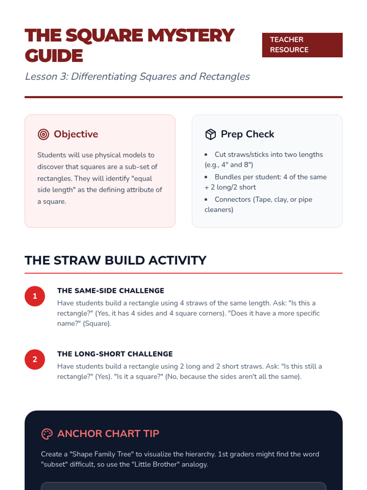 Teacher guidance for Lesson 3, focusing on distinguishing squares from rectangles through straw-building and hierarchical classification.