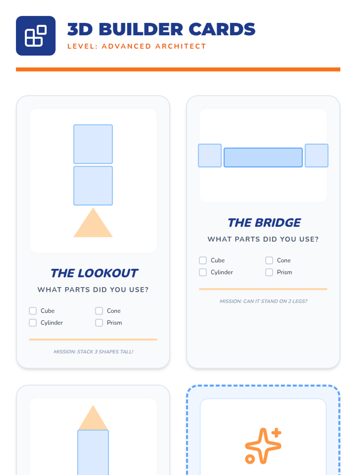 Scaffolded 3D shape composition cards that challenge students to build specific structures using solid blocks and identify the components used.