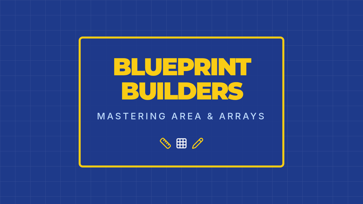 A visual presentation for the Blueprint Builders lesson, featuring skip counting warm-ups, the Khan Academy area video, and step-by-step activity instructions.