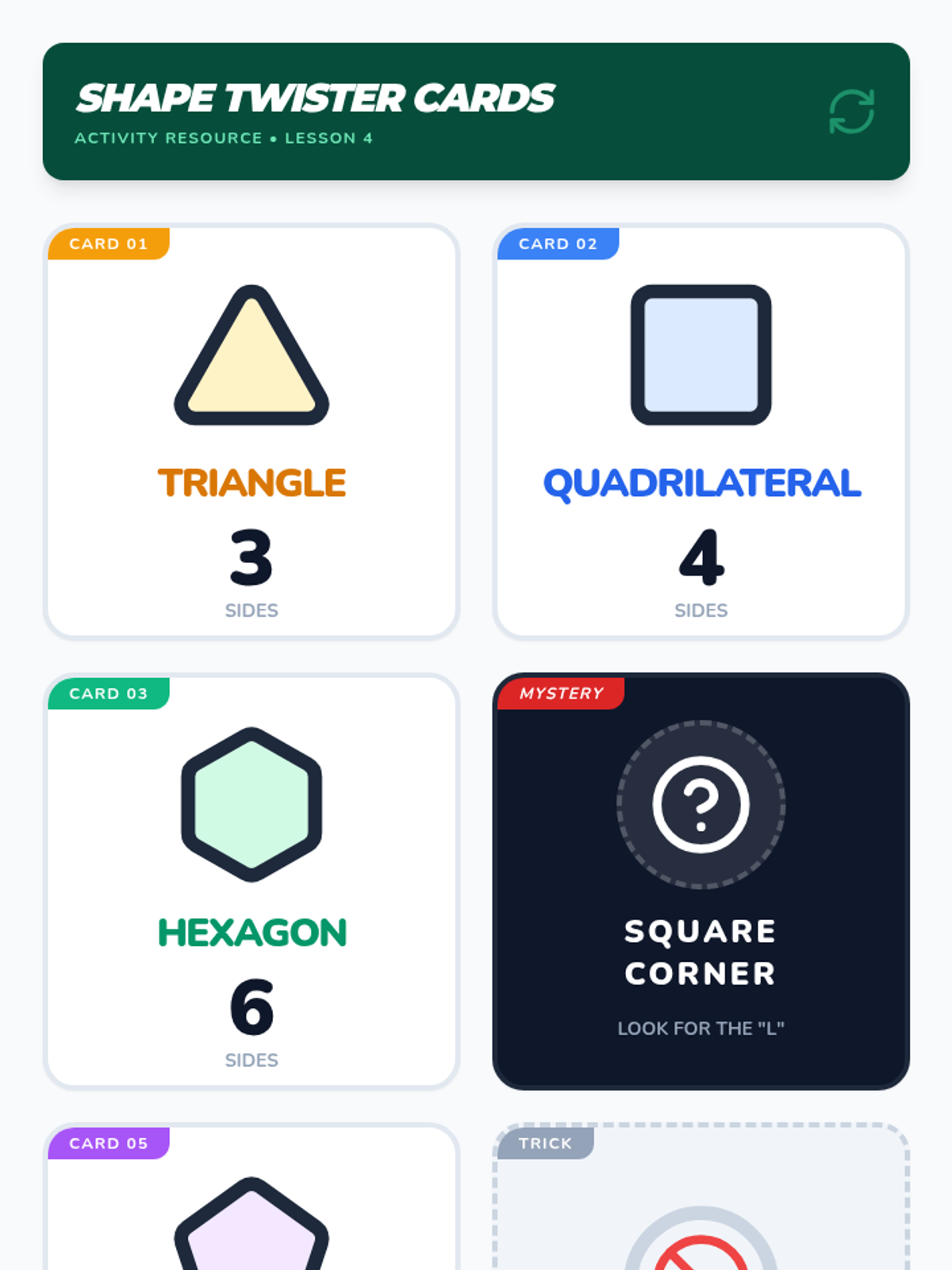 Activity cards for 'Shape Twister', featuring triangles, quadrilaterals, hexagons, pentagons, and trick cards like curved lines.