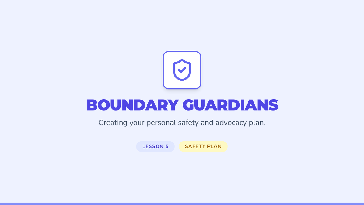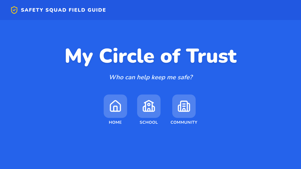 Visual slide deck for Lesson 5 synthesizing all previous concepts into a 'Safety Shield' framework. Includes a review of core skills and introduction to the trusted adult team concept.
