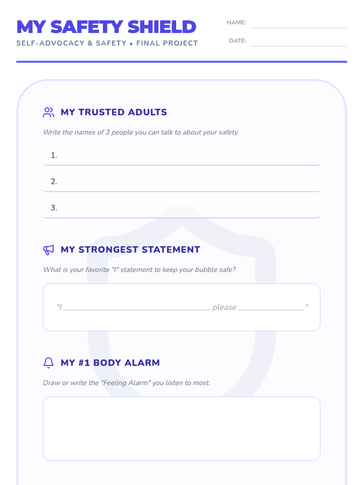 Capston project worksheet where students synthesize all sequence concepts into a personal 'Safety Shield'. Includes sections for trusted adults, strongest 'I' statements, and body alarms.