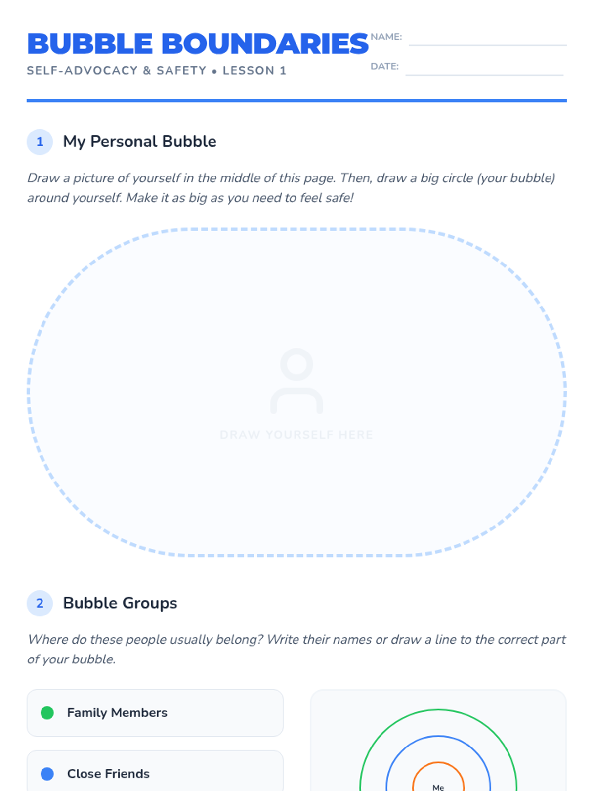 Student worksheet for mapping personal space boundaries. Includes a drawing area for their 'bubble' and a section for categorizing different groups of people by proximity.