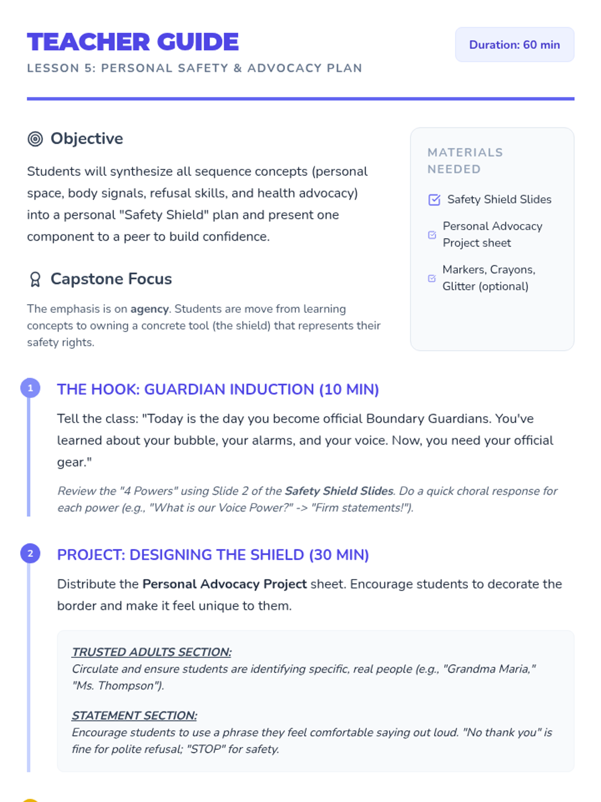 Teacher facilitation guide for Lesson 5. Focuses on the synthesis of concepts into a final project and the sharing of personal safety plans.