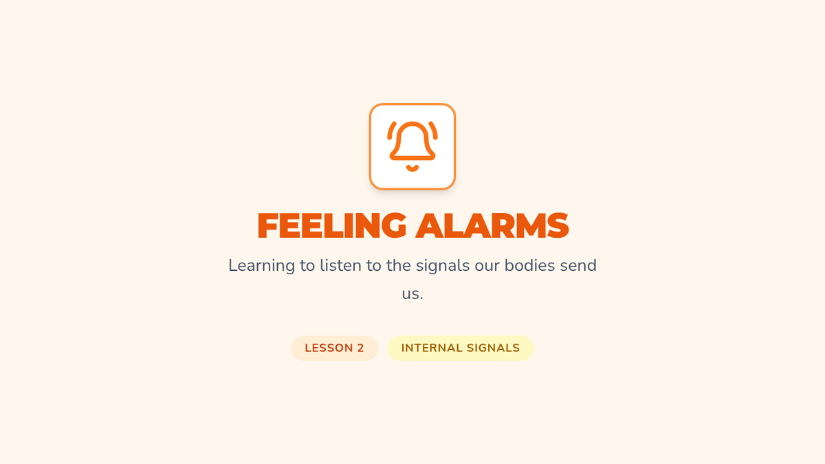 Introductory slide deck for Lesson 2 explaining 'Feeling Alarms'—physical body signals that indicate discomfort or a crossed boundary. Focuses on identifying racing hearts, butterflies, and sweaty palms.