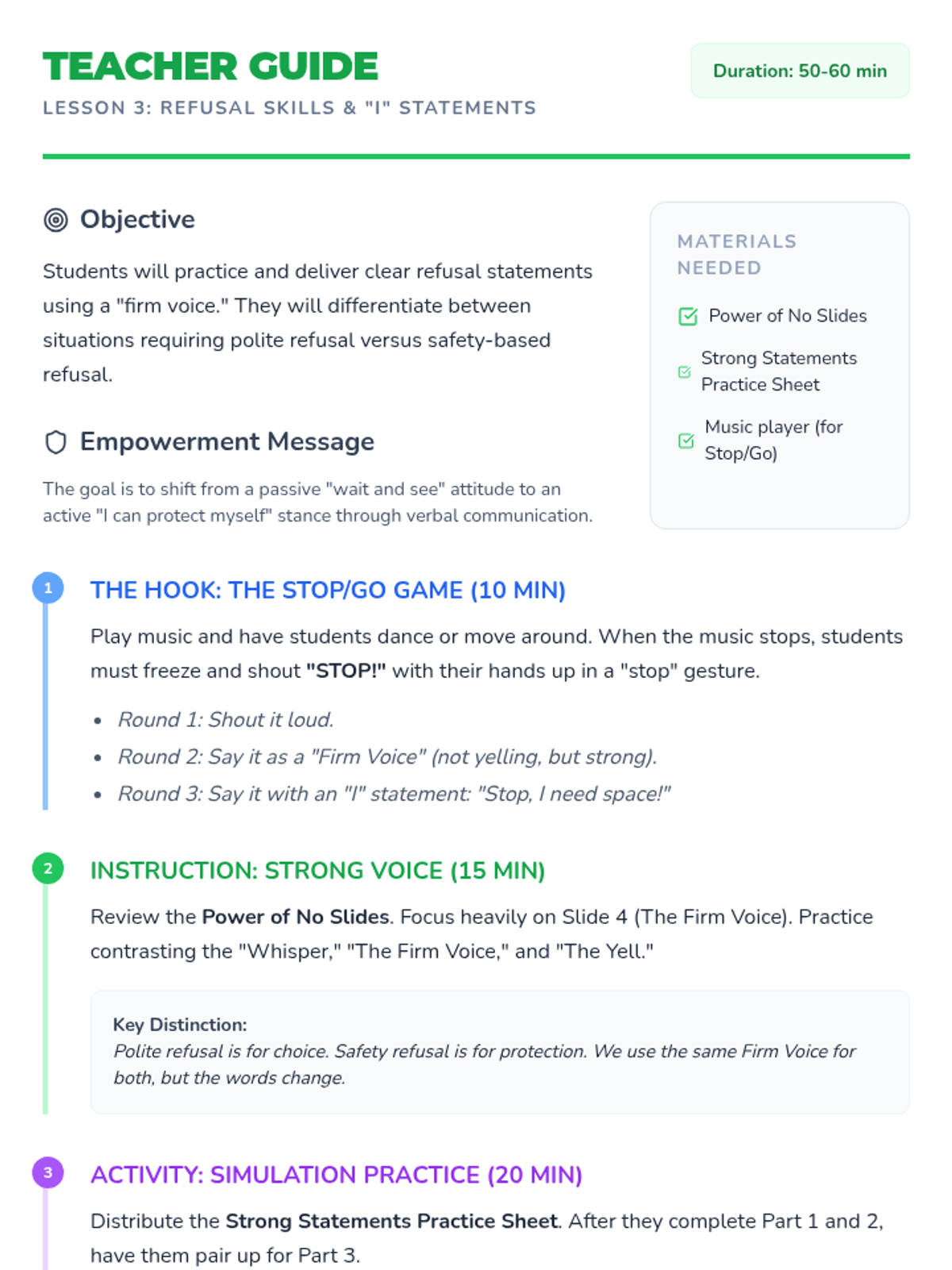 Teacher facilitation guide for Lesson 3 focusing on refusal skills, differentiating between polite and safety refusals, and practicing the 'firm voice' through 'I' statements.