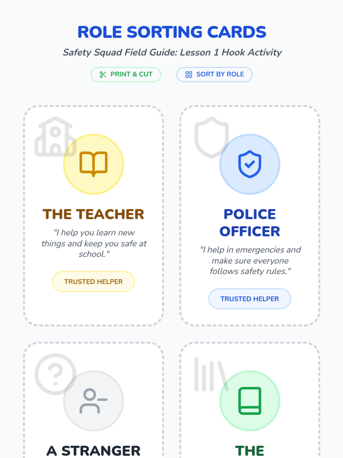 A set of printable cards featuring different community roles for students to sort into 'Trusted Helpers' and 'Strangers' as part of an introductory activity.