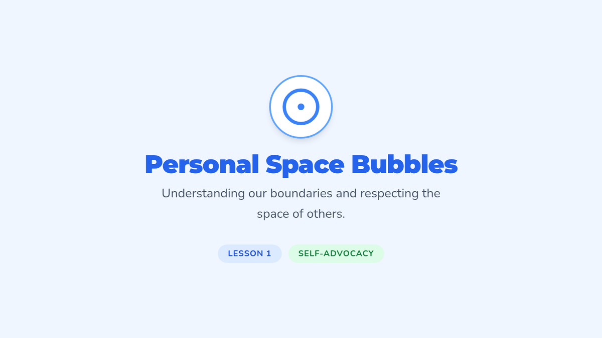 Visual slide deck for Lesson 1 introducing the concept of personal space through the 'Bubble' metaphor. Includes physical space expectations for different groups and the core message of body autonomy.