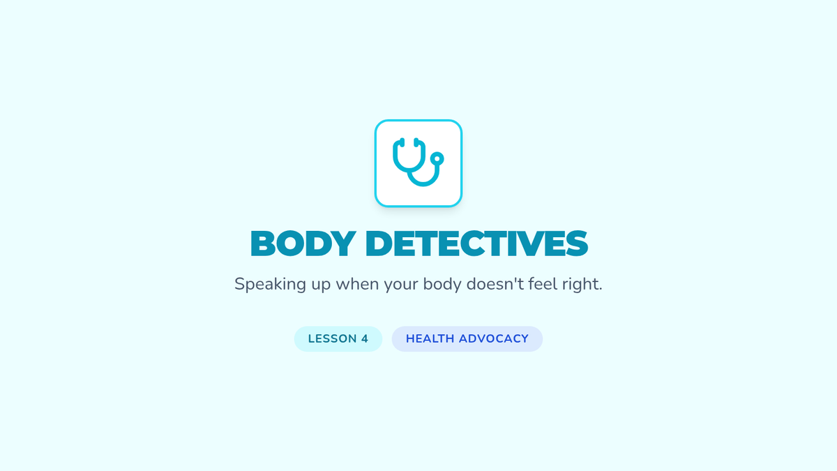 Introductory slide deck for Lesson 4 focusing on health advocacy, teaching students how to describe physical symptoms using the '3 Ws' (What, Where, When) to ensure they receive proper care.
