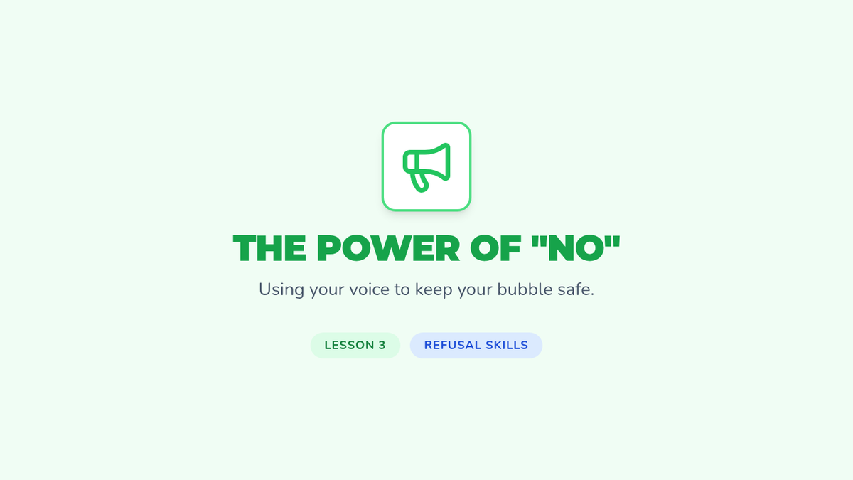 Introductory slide deck for Lesson 3 focusing on refusal skills, differentiating between polite and safety refusals, and practicing the 'firm voice' through 'I' statements.