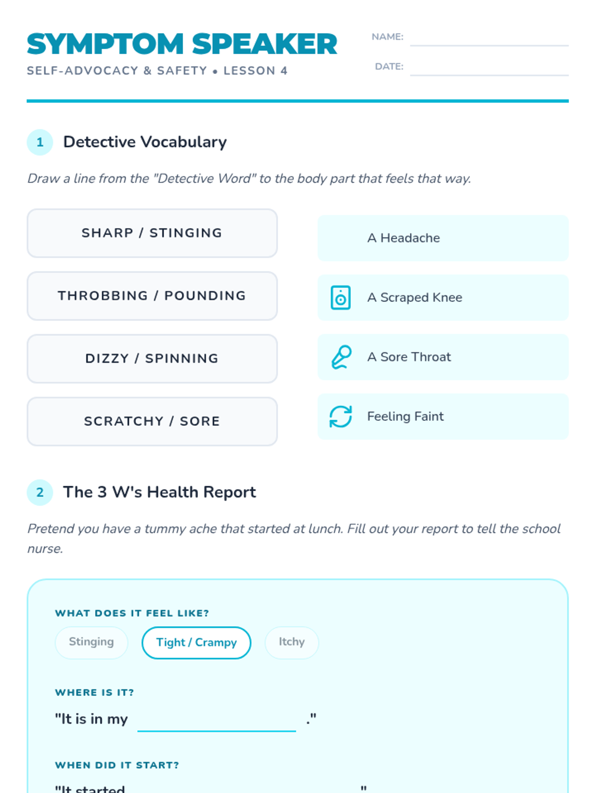 Student worksheet focusing on symptom vocabulary and practicing the '3 Ws' (What, Where, When) to describe physical illness or injury to an adult.