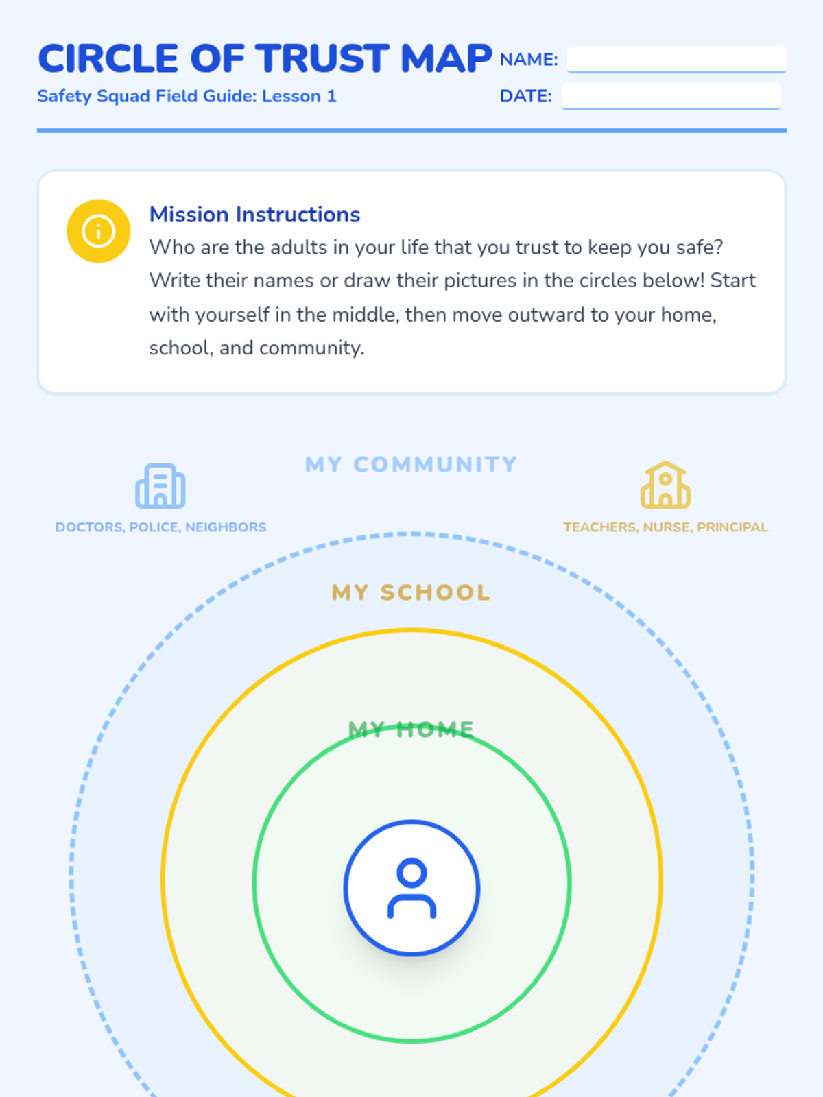 A visual mapping worksheet where students identify trusted adults in their home, school, and community environments.