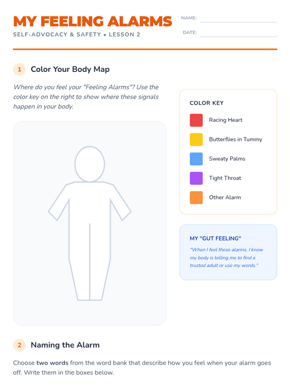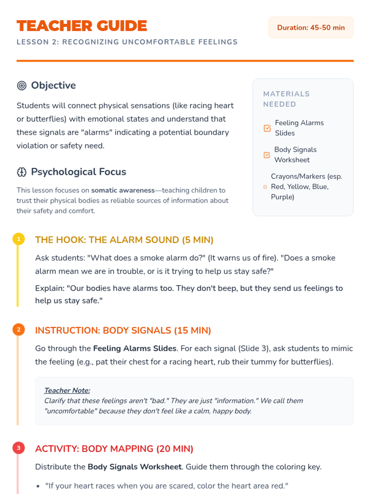 Teacher facilitation guide for Lesson 2. Focuses on somatic awareness and guiding students through identifying physical 'alarms' as internal indicators of discomfort.