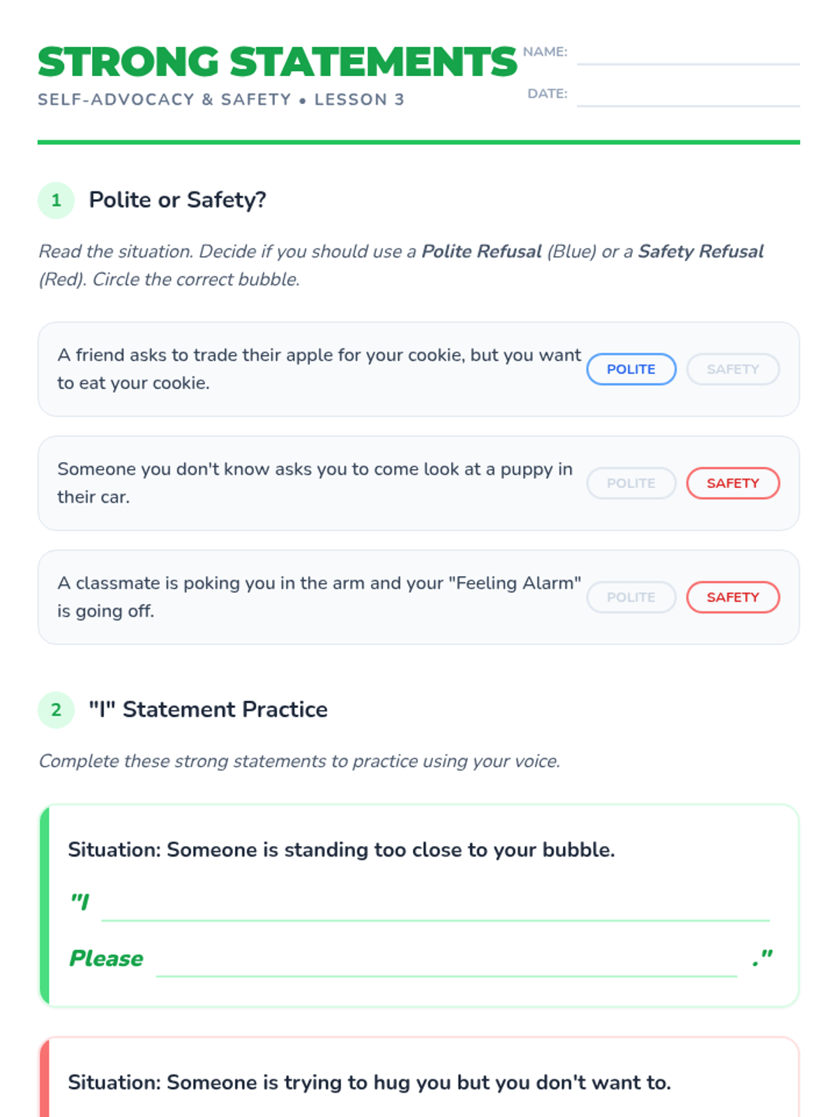 Student worksheet for practicing the formulation of 'I' statements and differentiating between polite and safety-based refusals. Includes scenarios and a phrase bank.