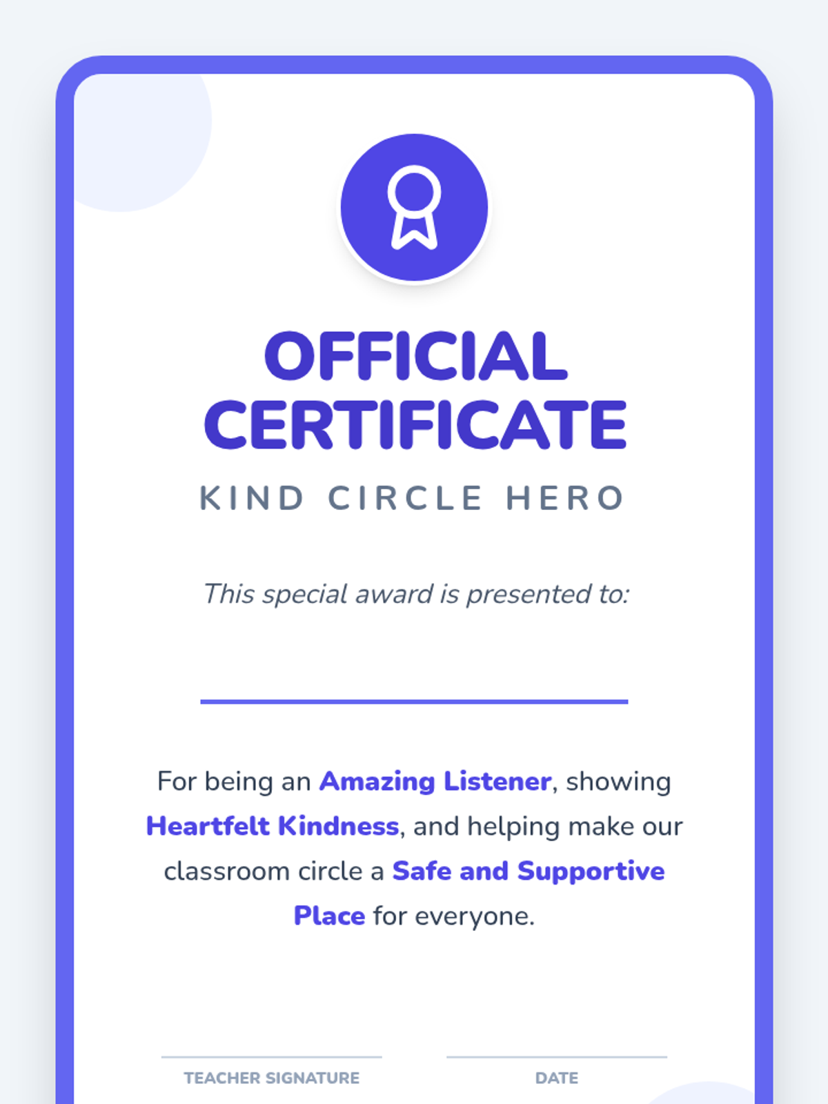 A decorative completion certificate for students who have participated in the Kind Circles sequence and demonstrated supportive behaviors.