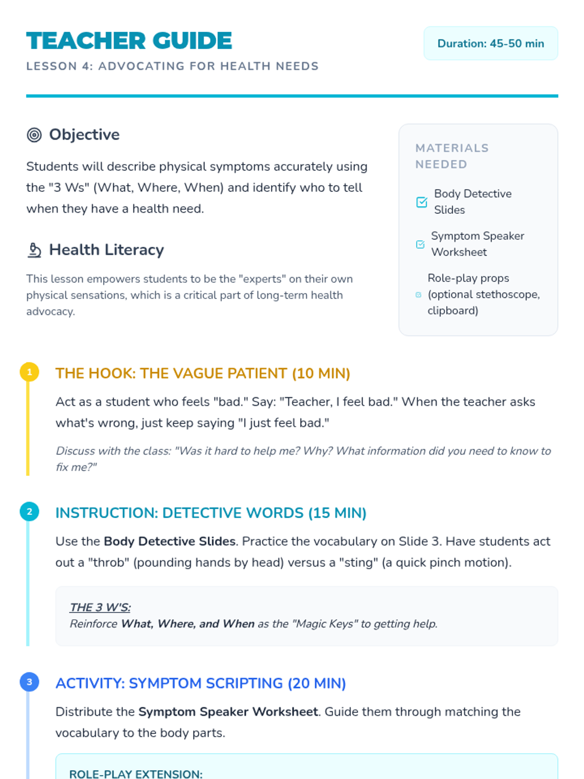 Teacher facilitation guide for Lesson 4. Focuses on health advocacy and guiding students through describing physical symptoms using the '3 Ws'.
