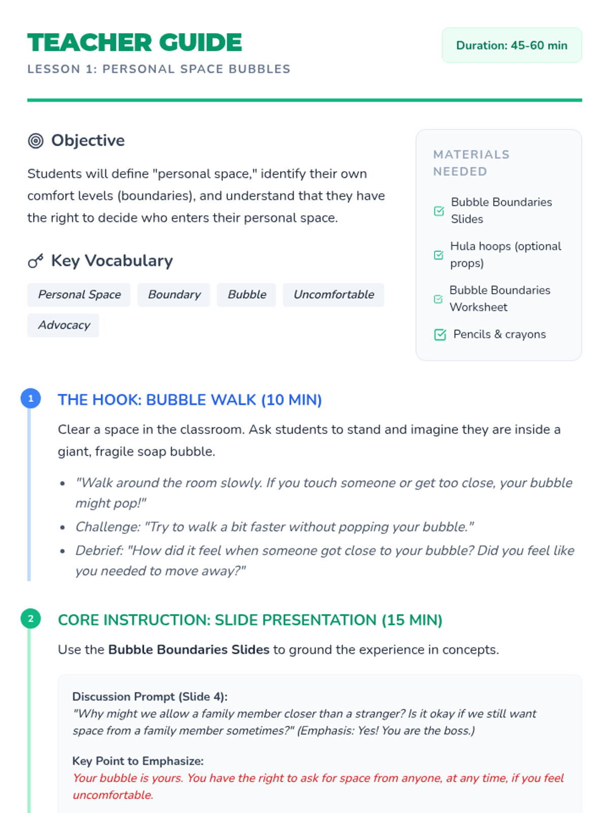 Facilitation guide for teachers conducting Lesson 1. Includes pacing, key talking points for slides, instructions for the 'Bubble Walk' hook, and differentiation strategies.