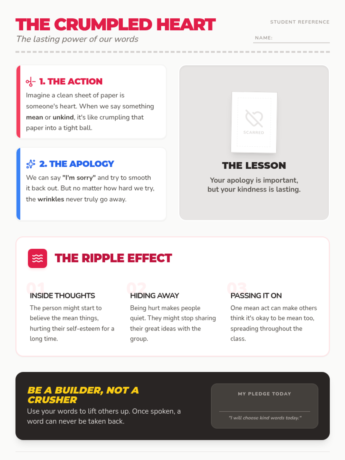 A compact, single-page student reference handout explaining the 'Crumpled Heart' analogy and the Ripple Effect. Designed for easy printing, it uses clear visuals and concise text to teach the lasting impact of unkind words.