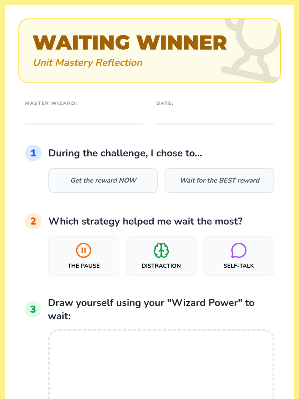 A student reflection worksheet for students to evaluate their performance and strategy use after the final waiting challenge.