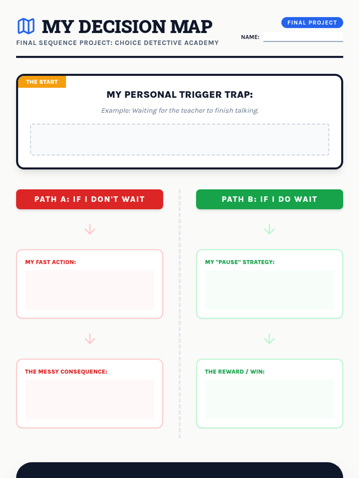 A capstone project worksheet where students create a personal decision-making flowchart to navigate their specific triggers using impulsive and patient pathways.