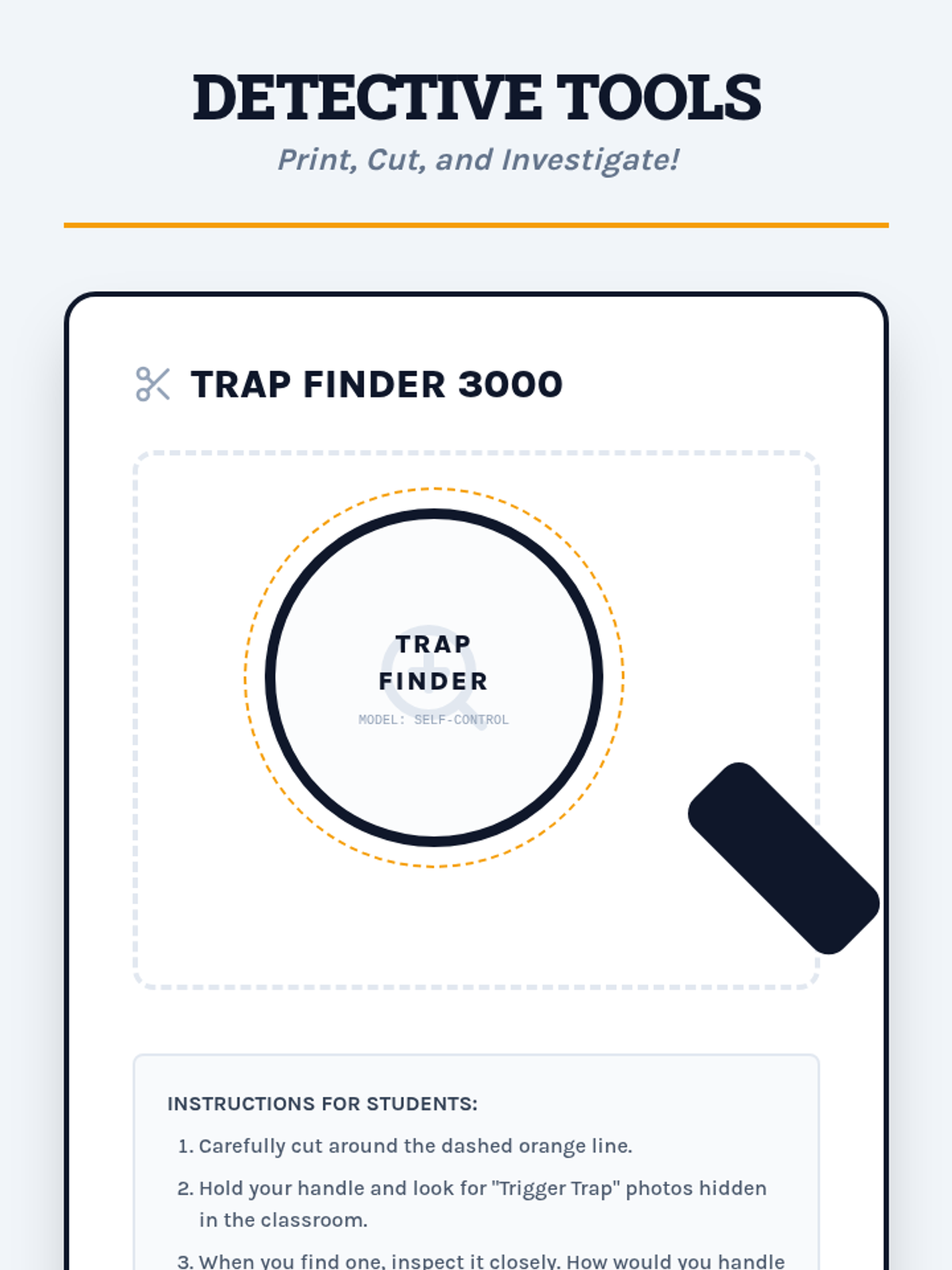 A printable 'Detective Magnifying Glass' template for students to use during a classroom scavenger hunt to identify personal triggers.