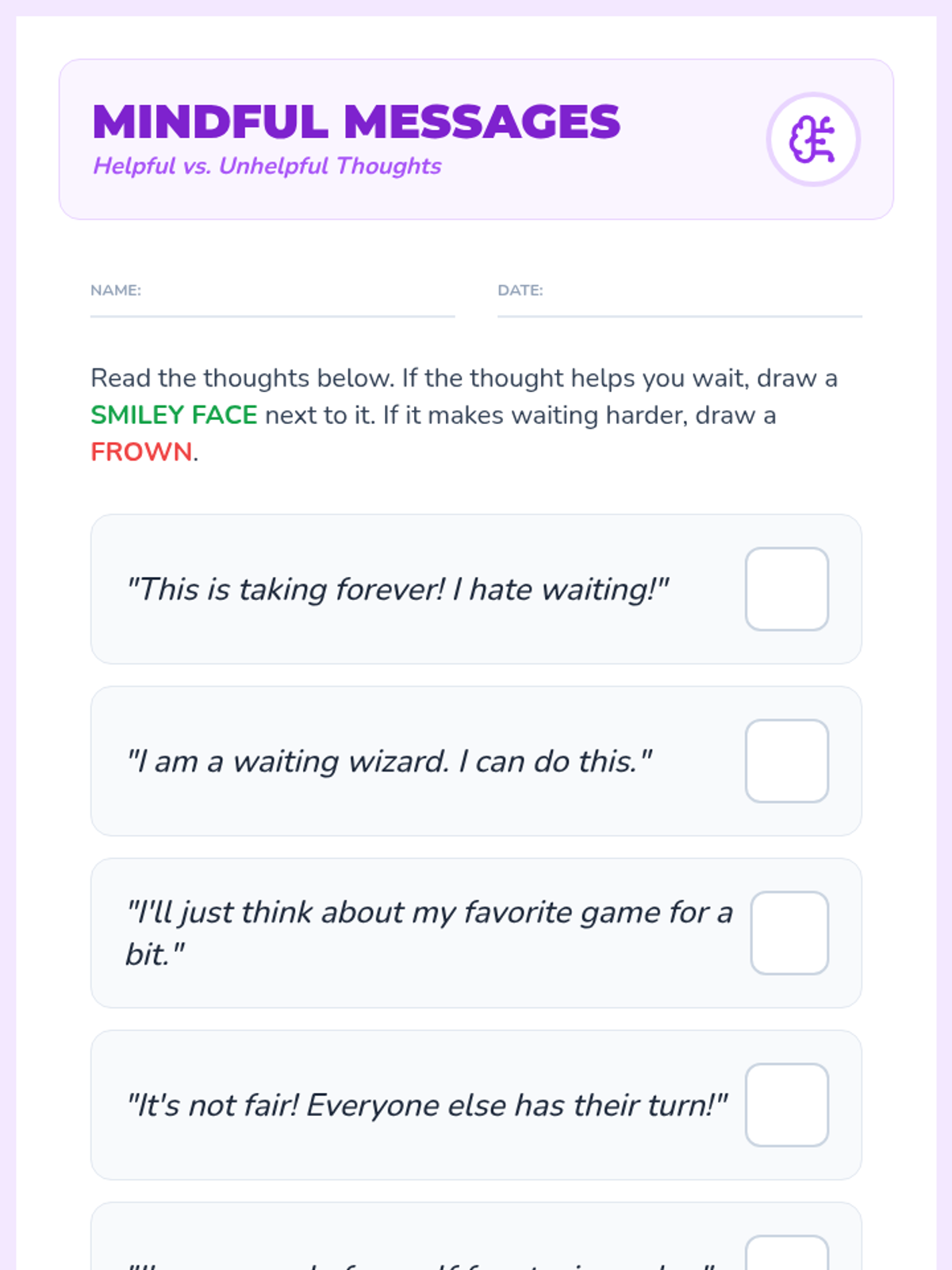 A student worksheet for identifying and generating helpful vs. unhelpful thoughts during waiting periods.
