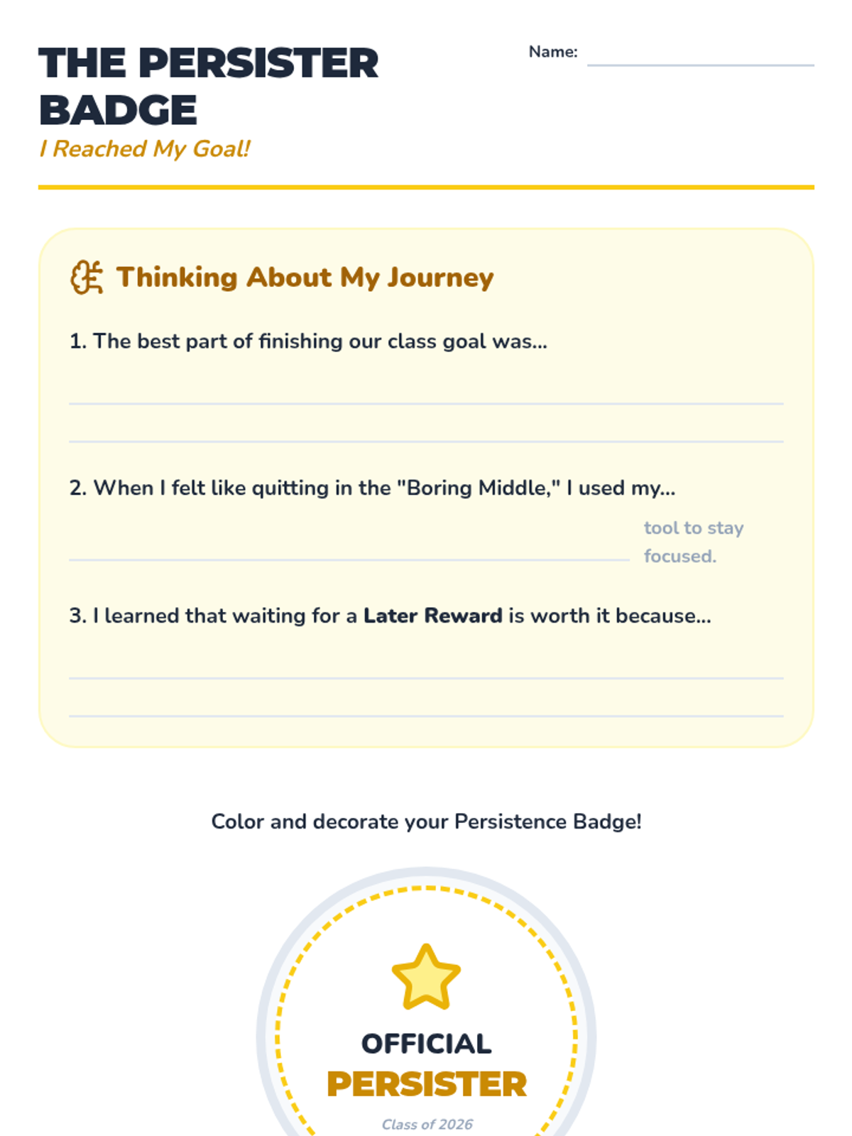 Reflection sheet for Lesson 5, where students decorate a 'Persister Badge' and answer prompts about their experience with delayed gratification.