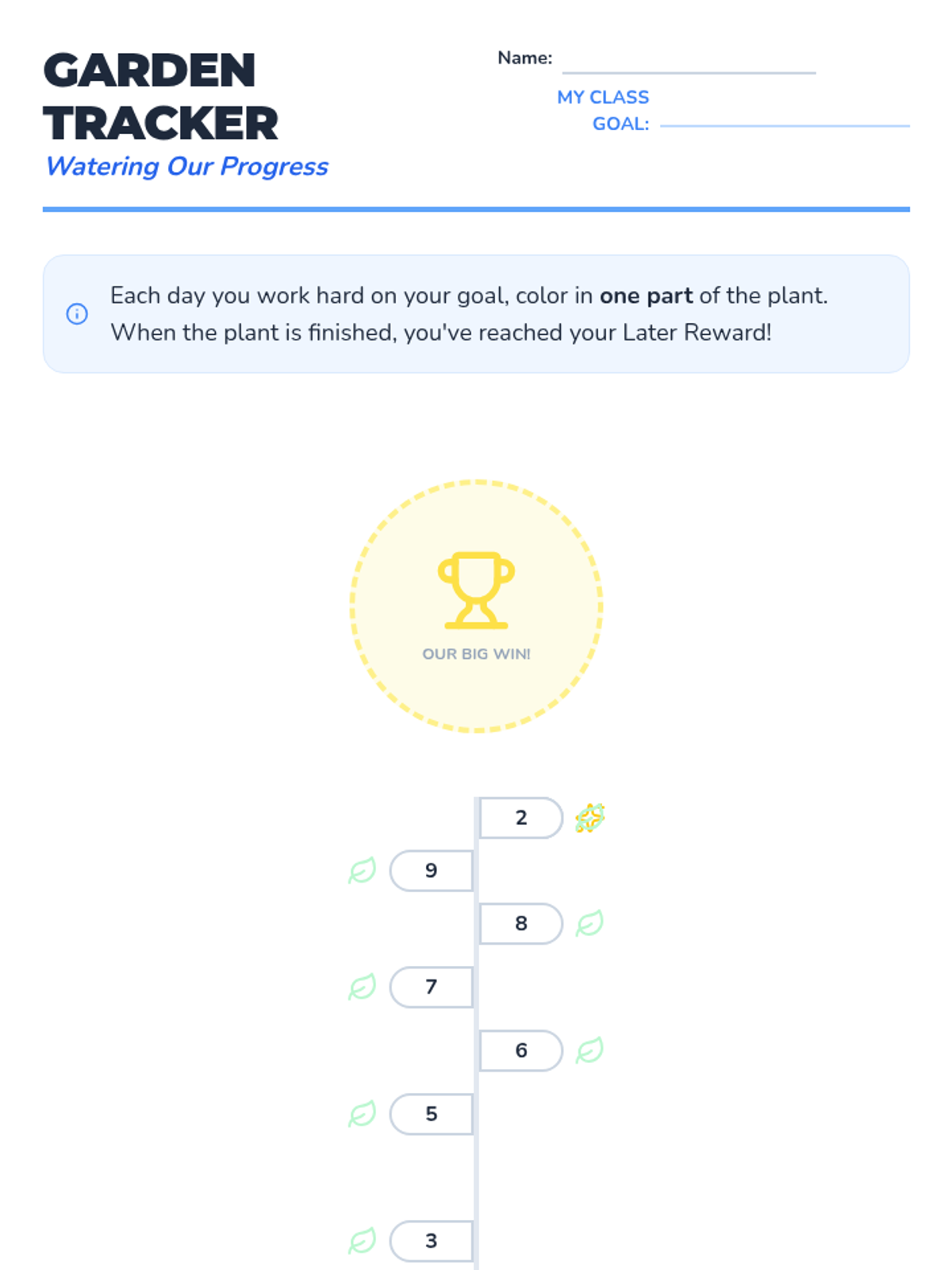 Individual progress tracker shaped like a growing plant, where students color in sections each day to visualize their progress toward the goal.