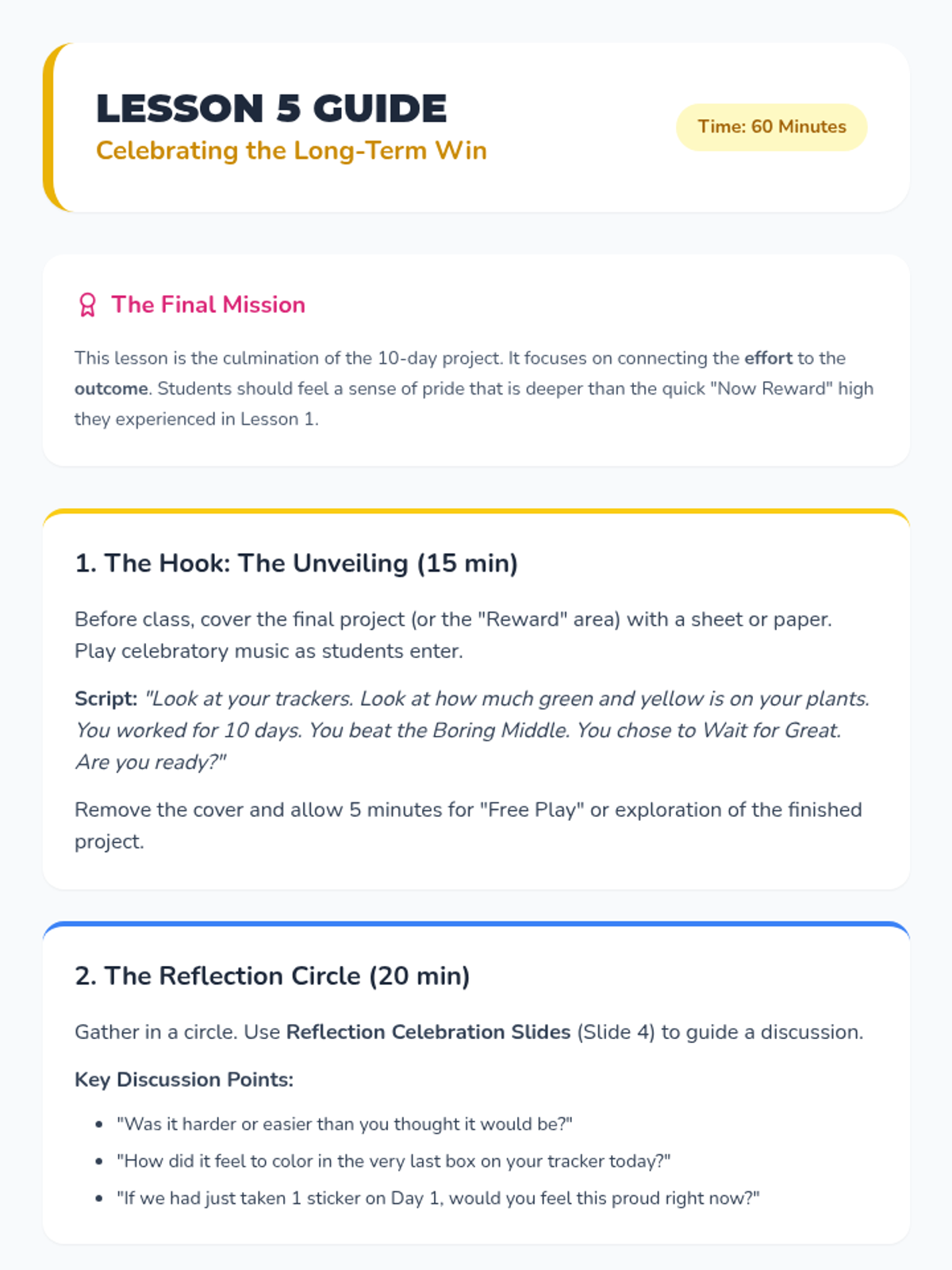 Facilitator guide for Lesson 5, focusing on the satisfaction of completing the long-term goal and awarding the Persistence Badges.