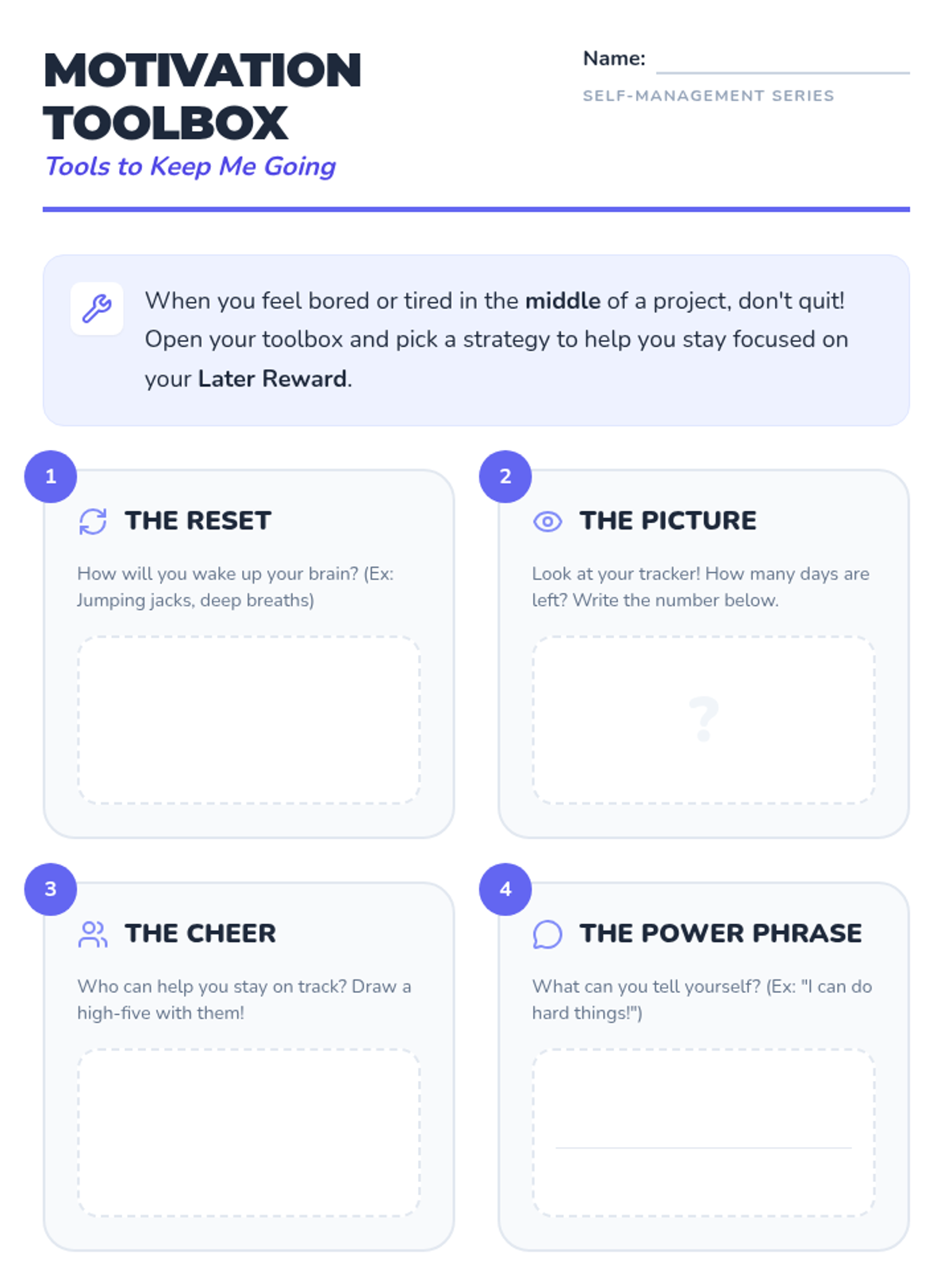 Worksheet for students to identify and draw personal motivation strategies to use when a project becomes difficult or boring.