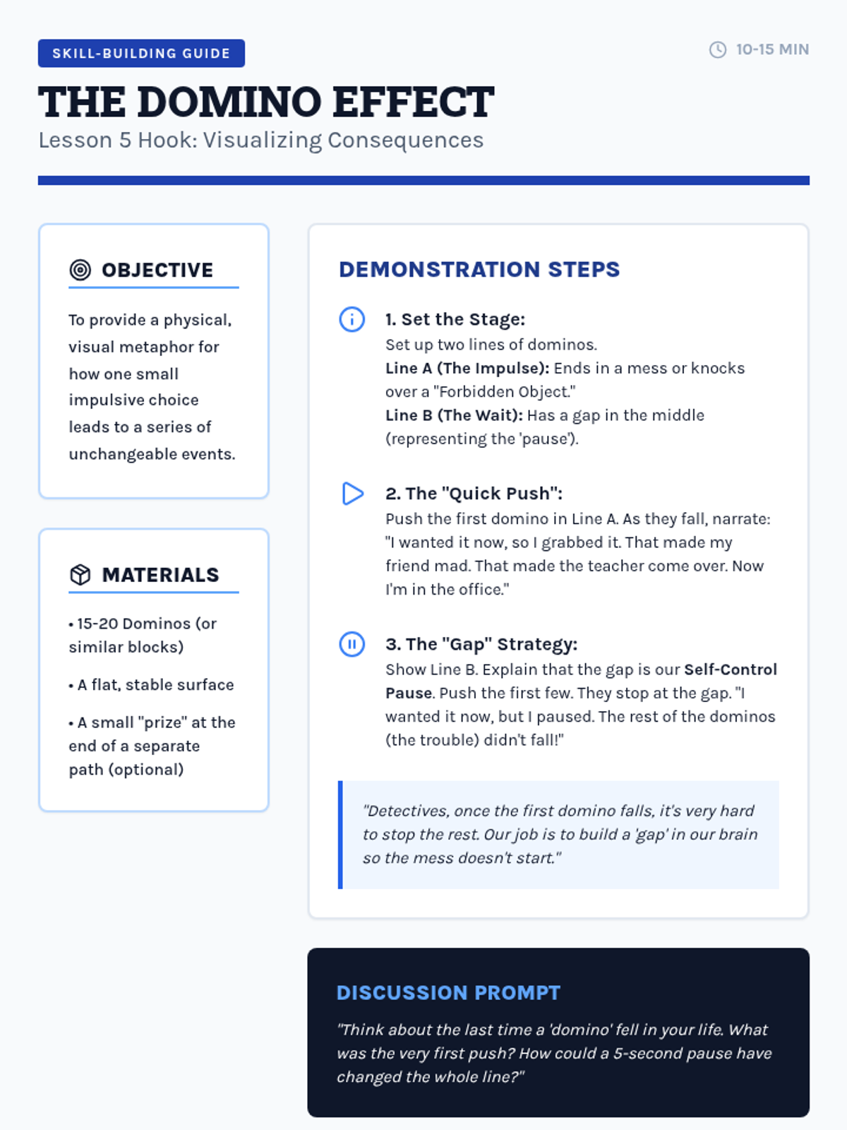 A teacher guide for a 'Domino Effect' demonstration that visually illustrates the chain reaction of impulsive choices versus the power of a pause.
