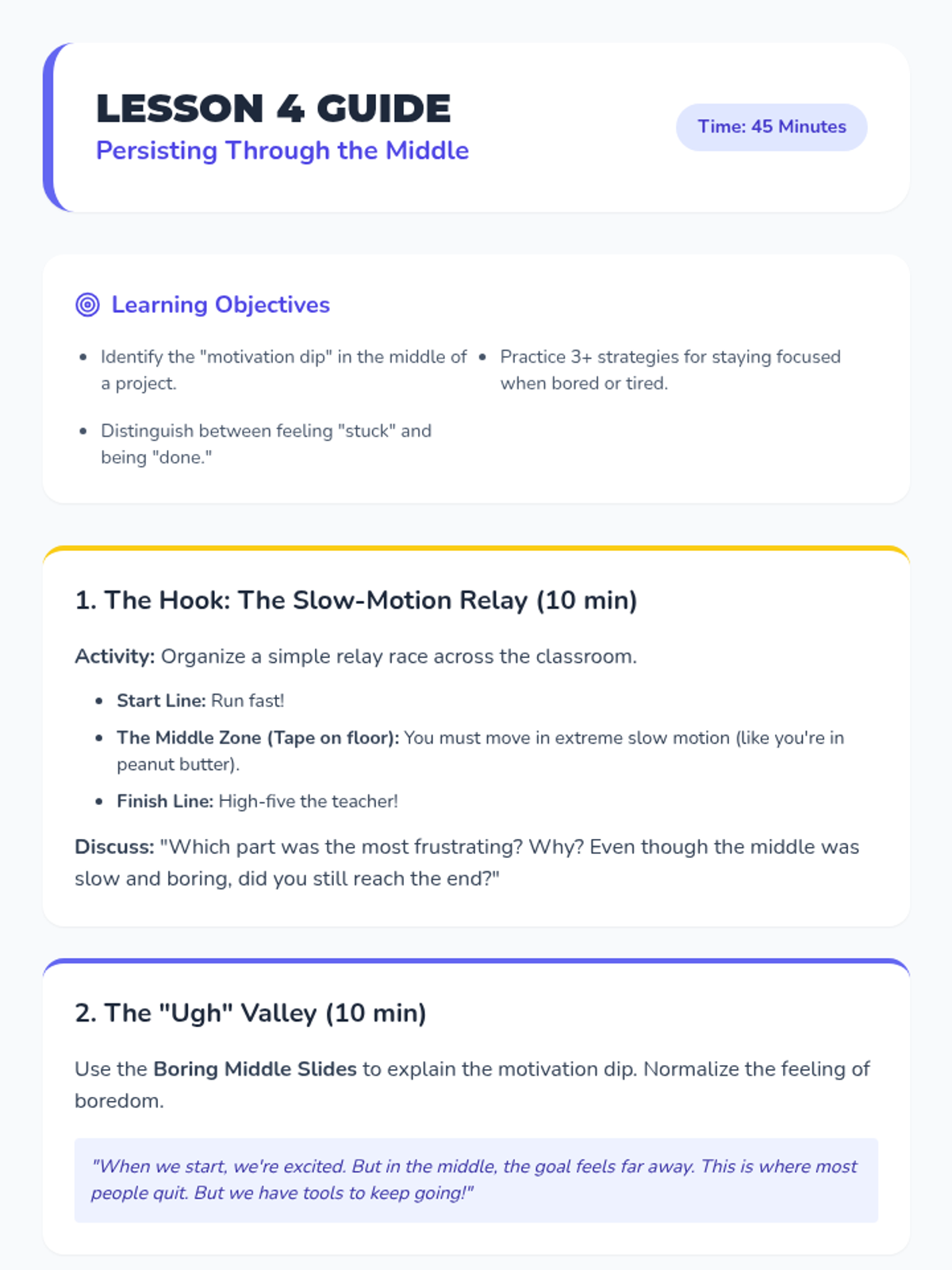 Teacher guide for Lesson 4, focusing on the relay race hook and managing the 'motivation dip' during the project.
