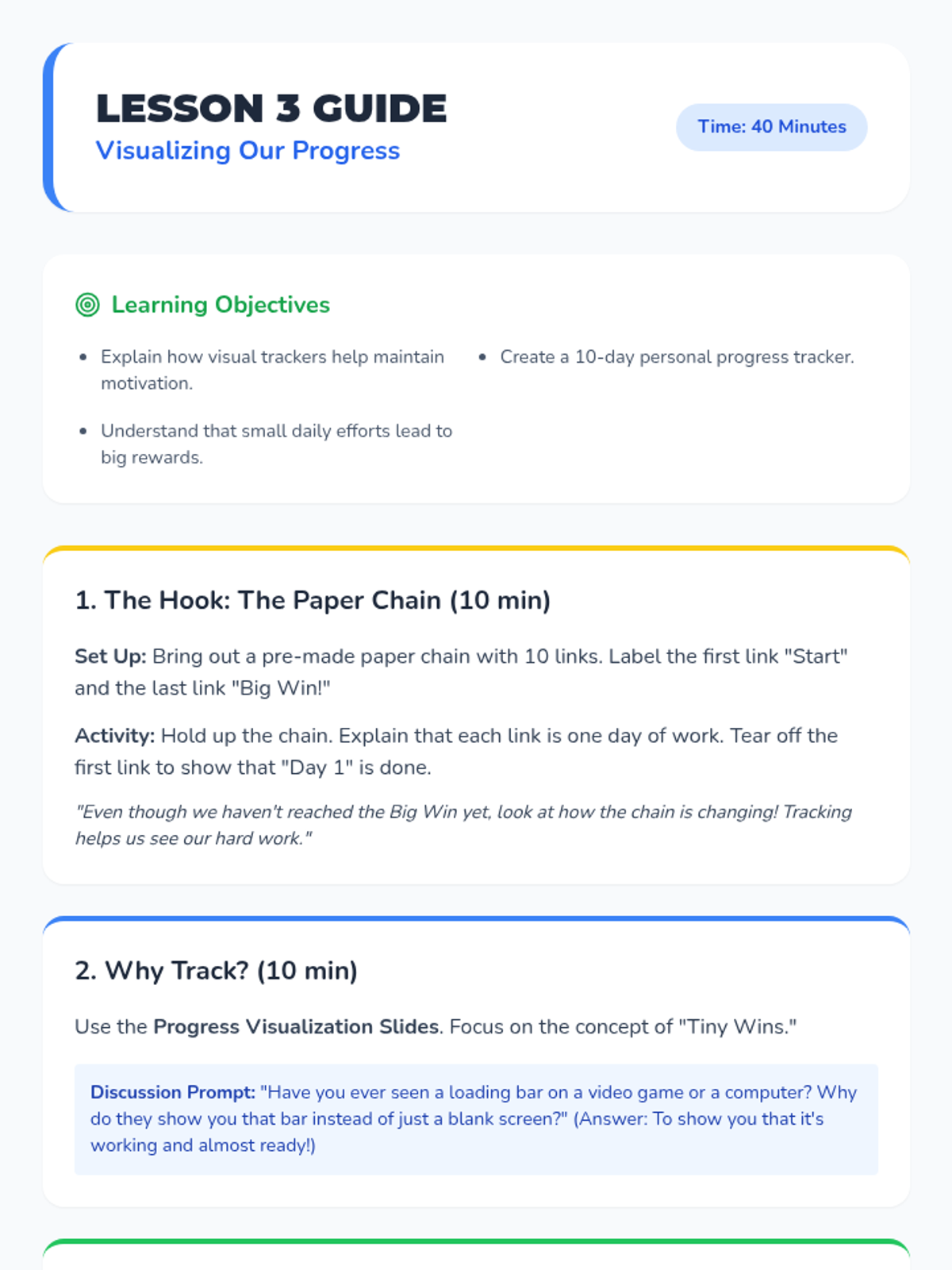 Teacher guide for Lesson 3, focusing on the paper chain hook and establishing the daily tracker routine for students.