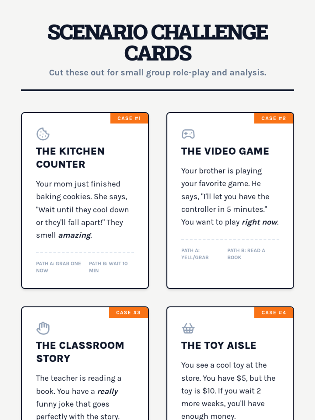 A set of scenario cards for small-group role-play activities where students practice impulsive versus patient responses to common triggers.