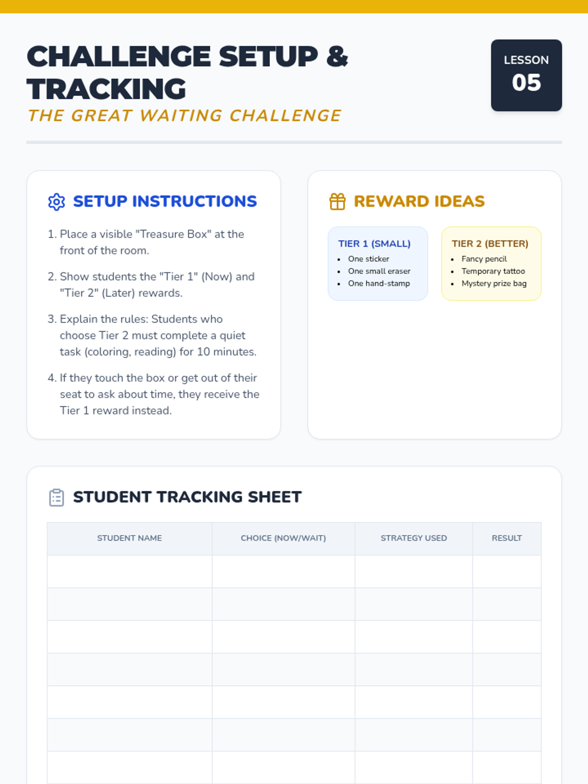 Visual aids for Lesson 5 to help students apply the strategies learned throughout the unit during a final waiting challenge.