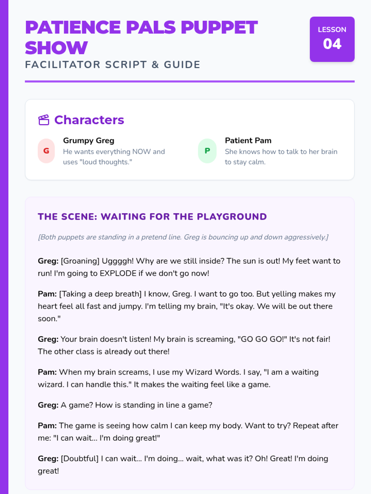A puppet show script featuring characters 'Grumpy Greg' and 'Patient Pam' to demonstrate the power of self-talk during waiting periods.