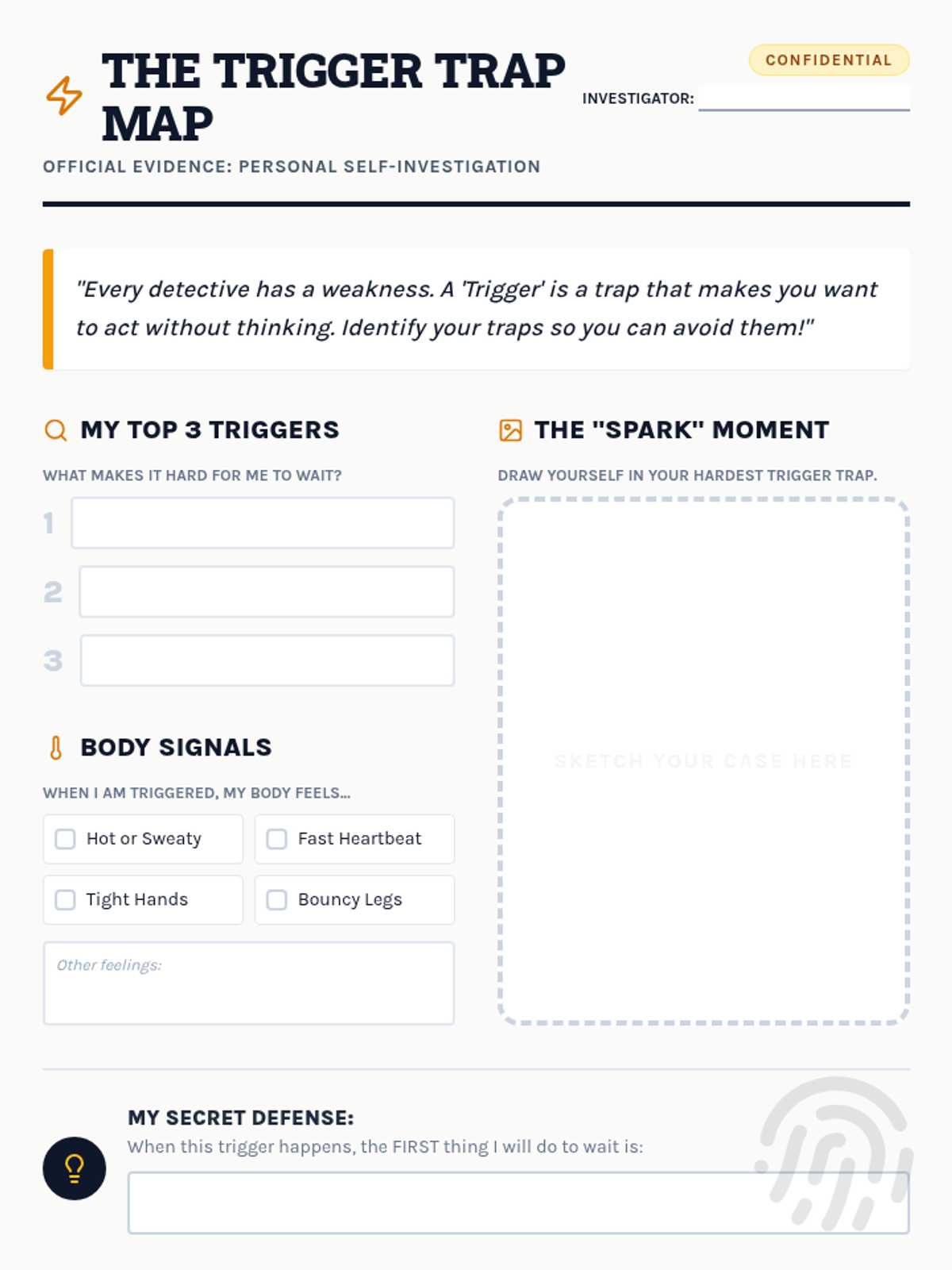 A reflective worksheet for students to identify their personal triggers and recognize the physical signals of impulsivity.