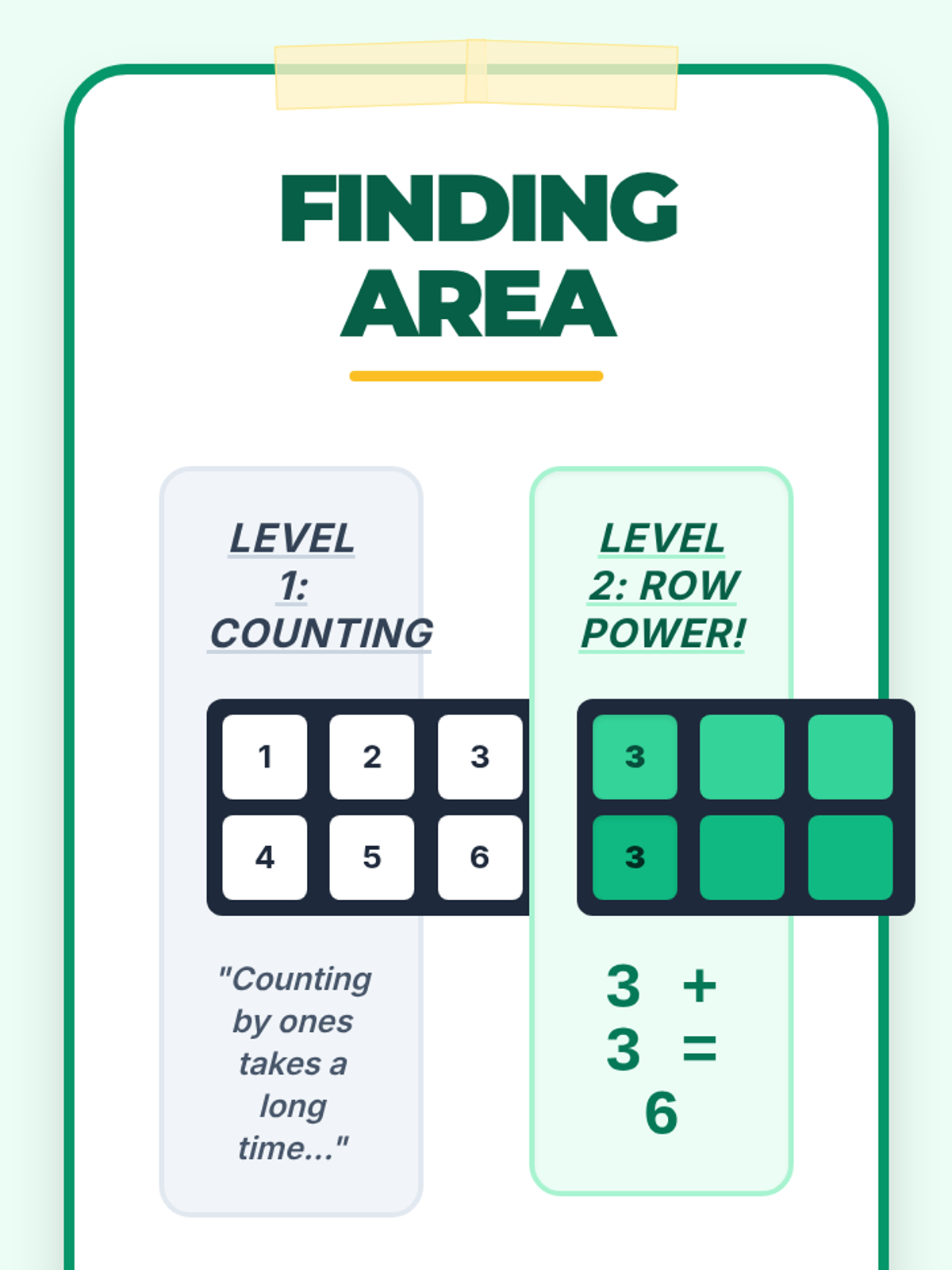Visual instructional slides for a small group intervention on area. Features clear vocabulary for rows and columns, visual tiling rules, and step-by-step repeated addition connections.