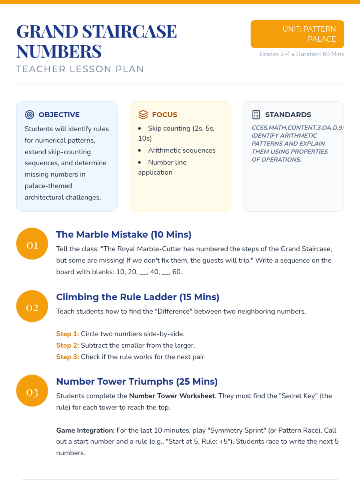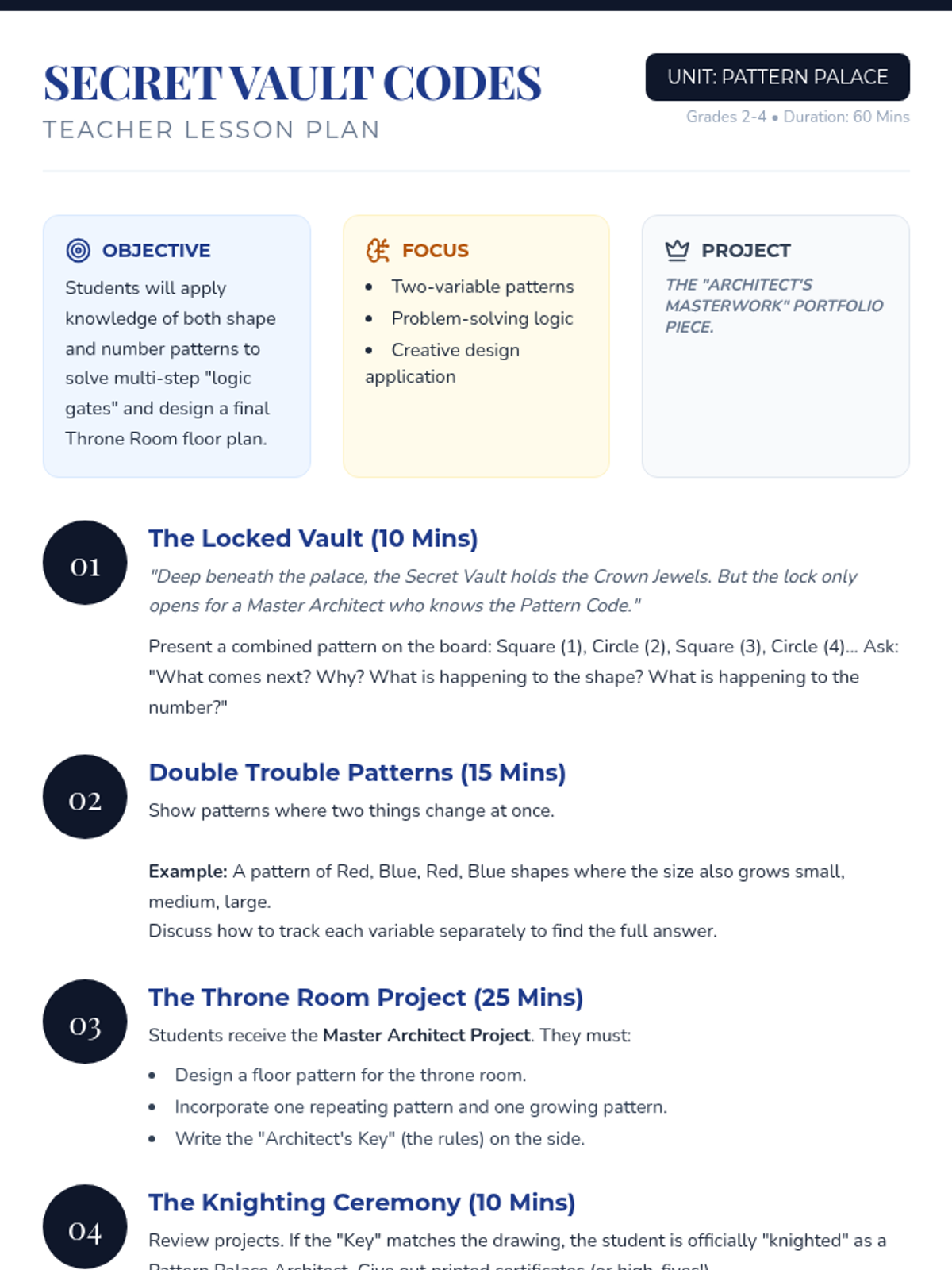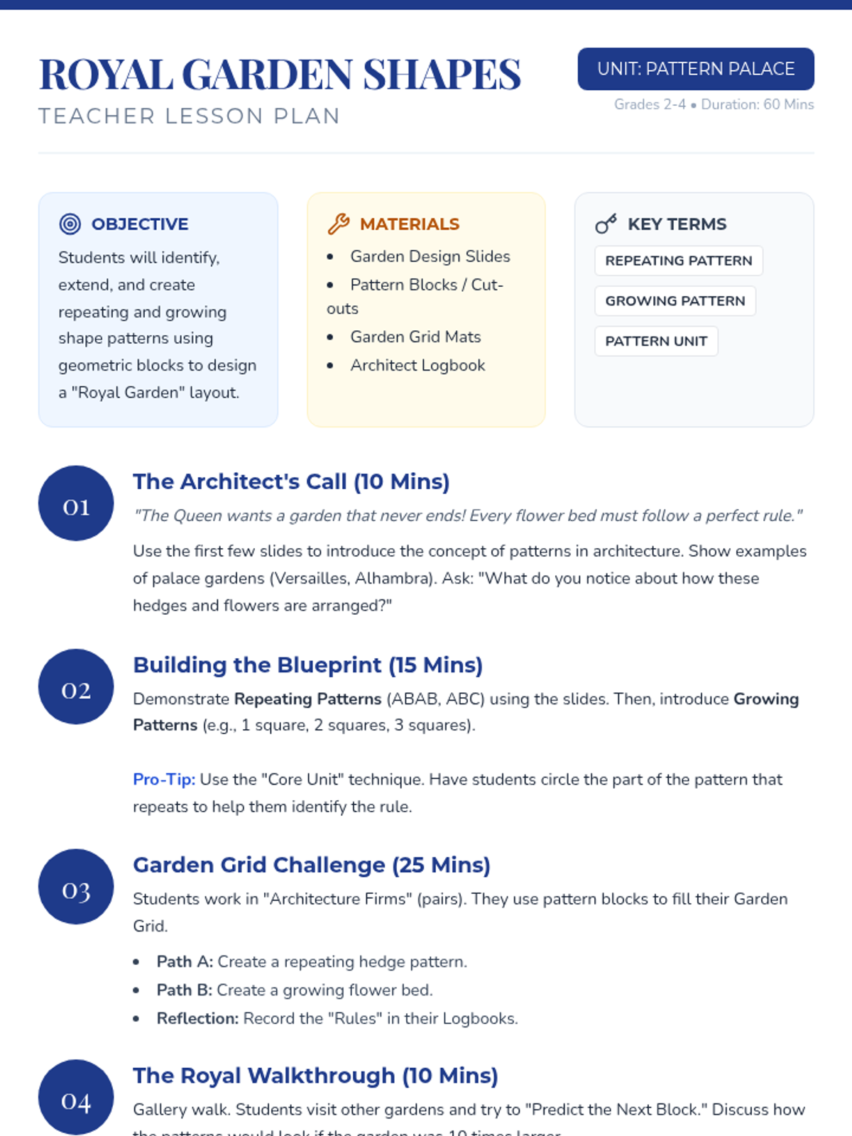 A comprehensive instructional guide for teachers to lead the Pattern Palace Architects lesson, including objectives, materials, timed activities, and differentiation strategies.