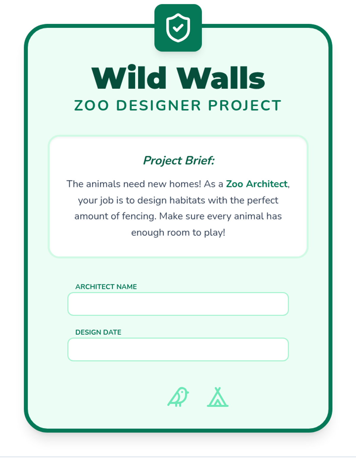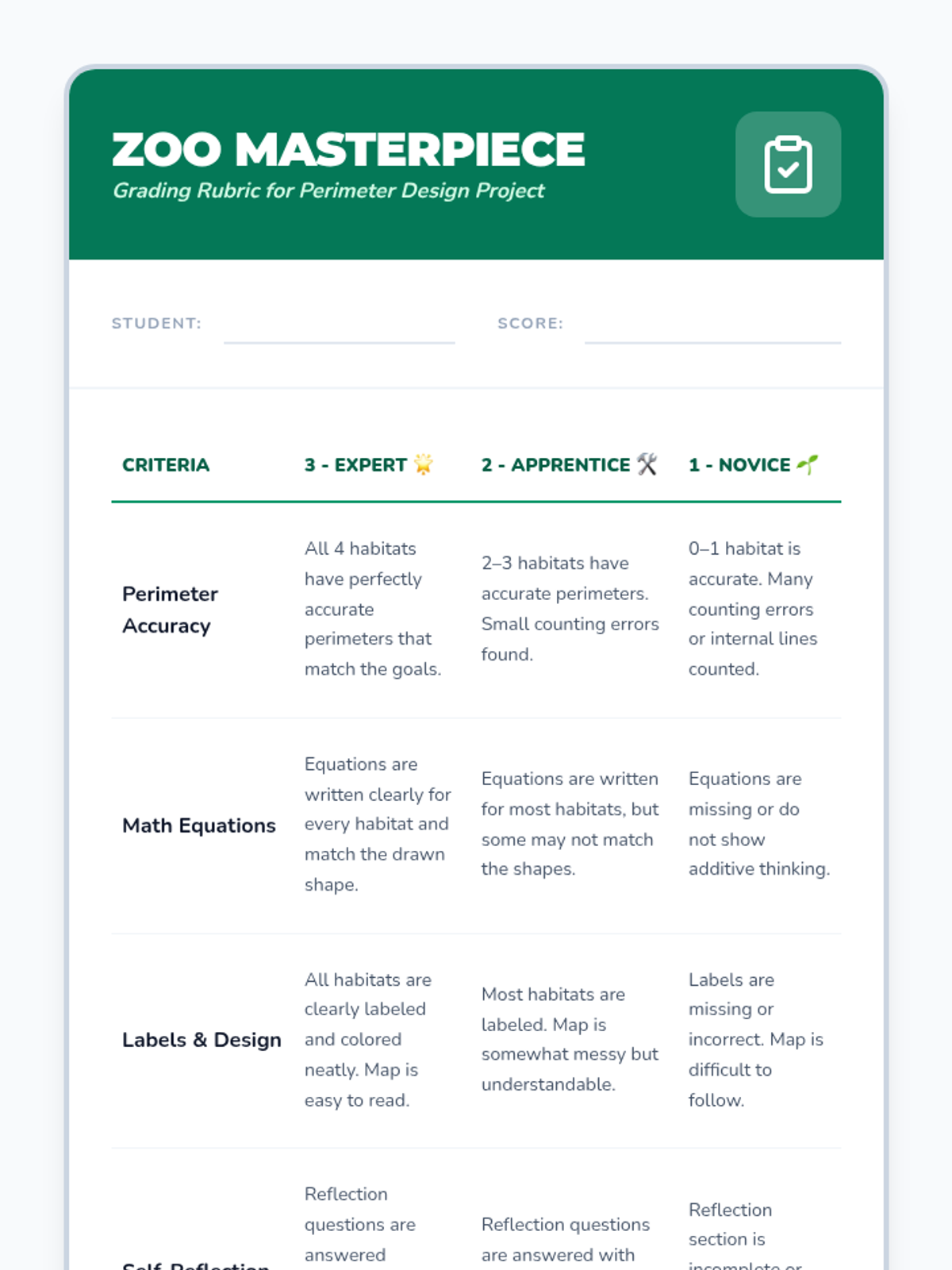 A clear grading rubric for the Zoo Designer project, evaluating perimeter accuracy, mathematical equations, design clarity, and reflection.