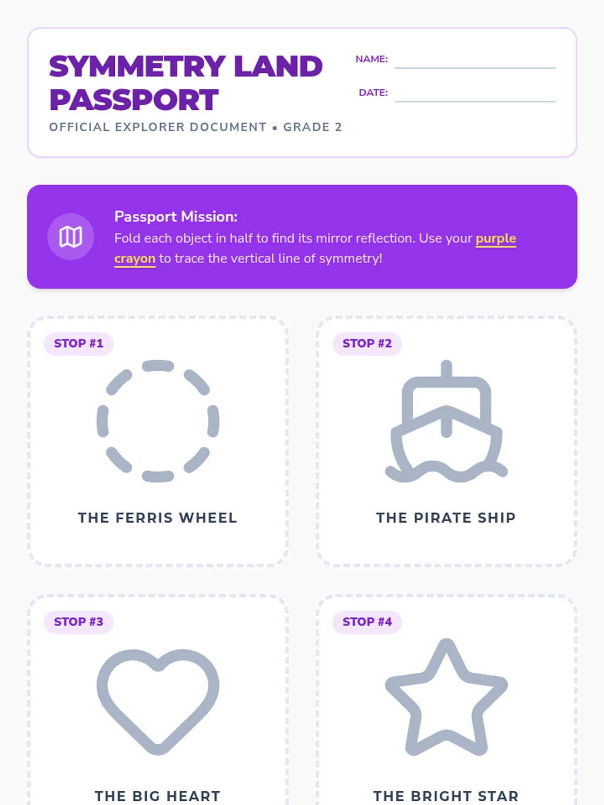 A fun, amusement-park-themed worksheet where students identify and trace vertical lines of symmetry for objects seen in the Symmetry Land video.