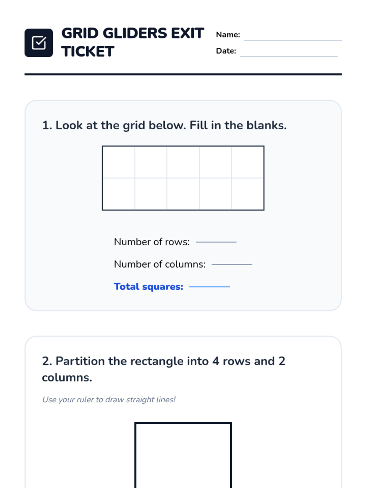 A formative assessment exit ticket for the Grid Gliders lesson. It features three items: identifying rows and columns in a given grid, partitioning a blank rectangle into 4 rows and 2 columns, and identifying an array with a specific total count.