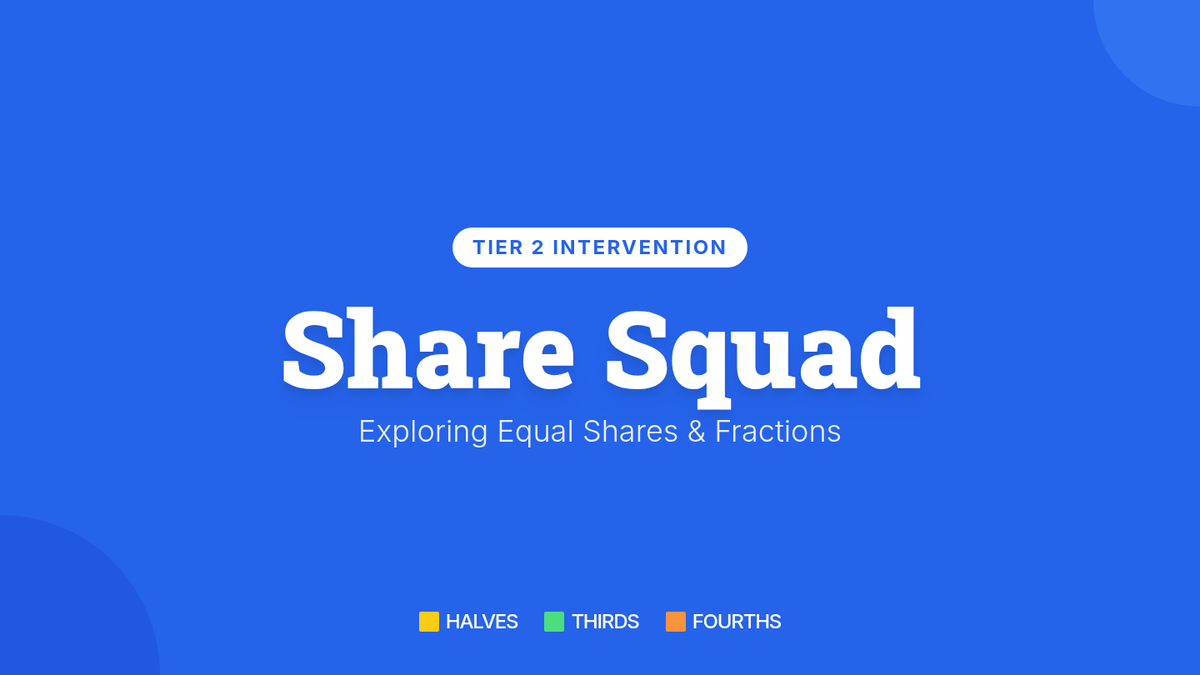 A bright, visual slide deck for Grade 2 Tier 2 instruction on partitioning shapes. Focuses on the definition of equal shares, halves, thirds, and fourths with clear geometric examples.
