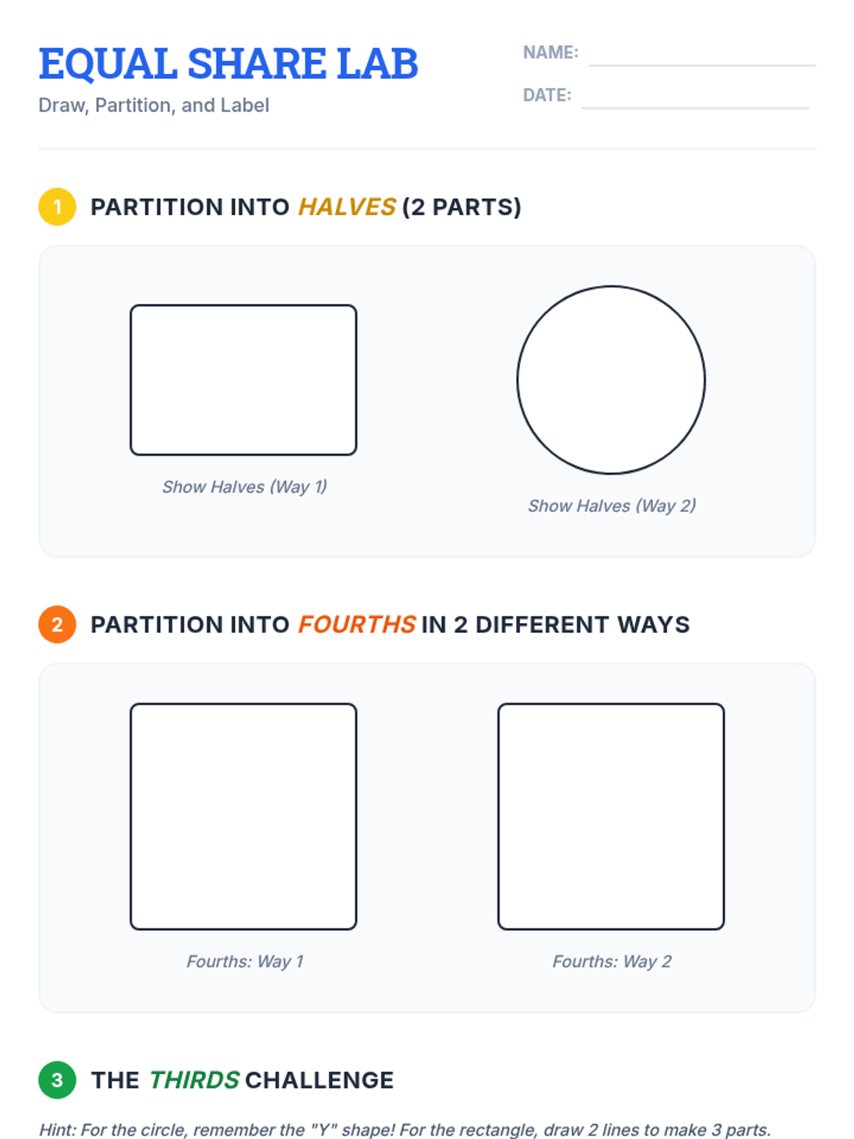 A guided practice worksheet for students to partition rectangles and circles into halves, thirds, and fourths. Includes a challenge to show fourths in two different ways.