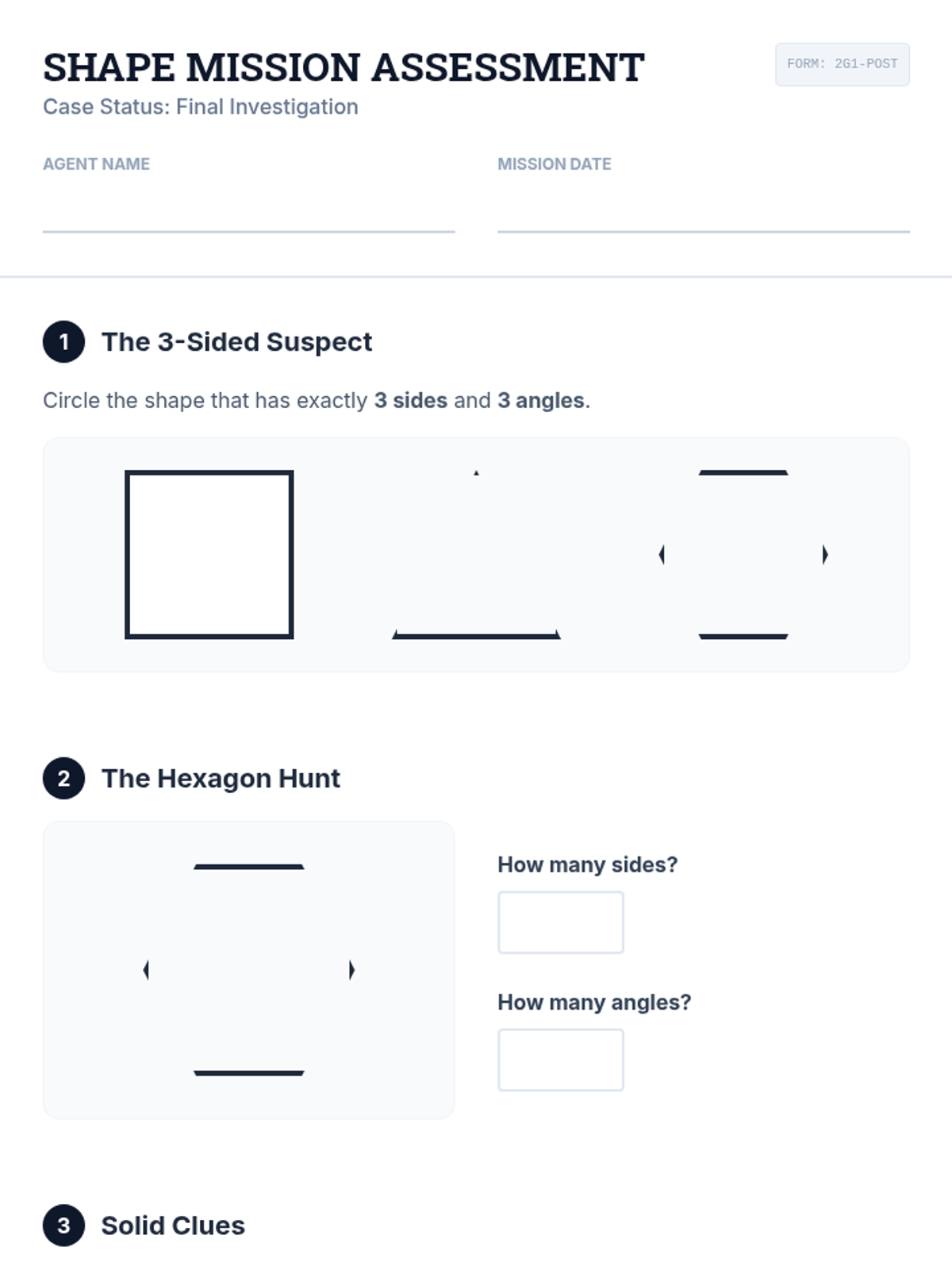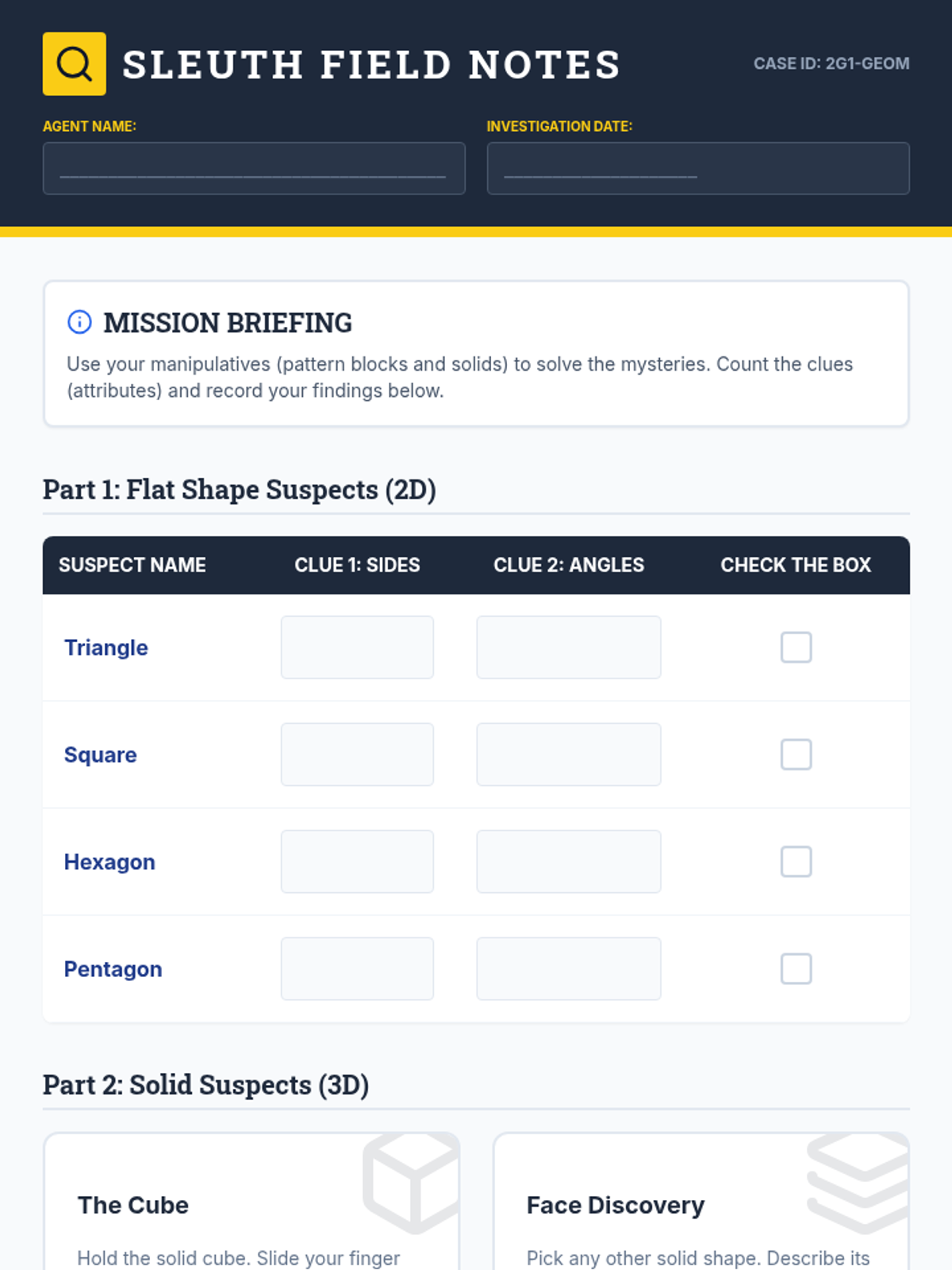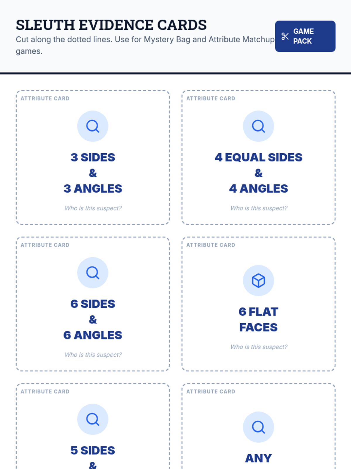 A set of printable "Sleuth Evidence Cards" featuring attribute clues (e.g., "3 sides & 3 angles") and matching shape name cards. Ideal for attribute games like Mystery Bag or matching activities.