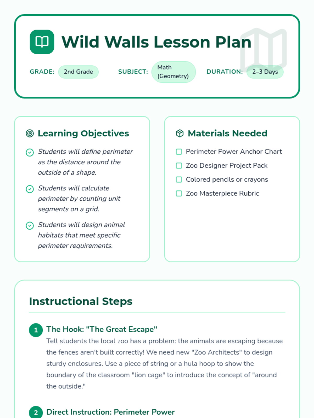 A comprehensive teacher's lesson plan for a 2nd-grade perimeter project, including learning objectives, a step-by-step instructional flow, and differentiation strategies.