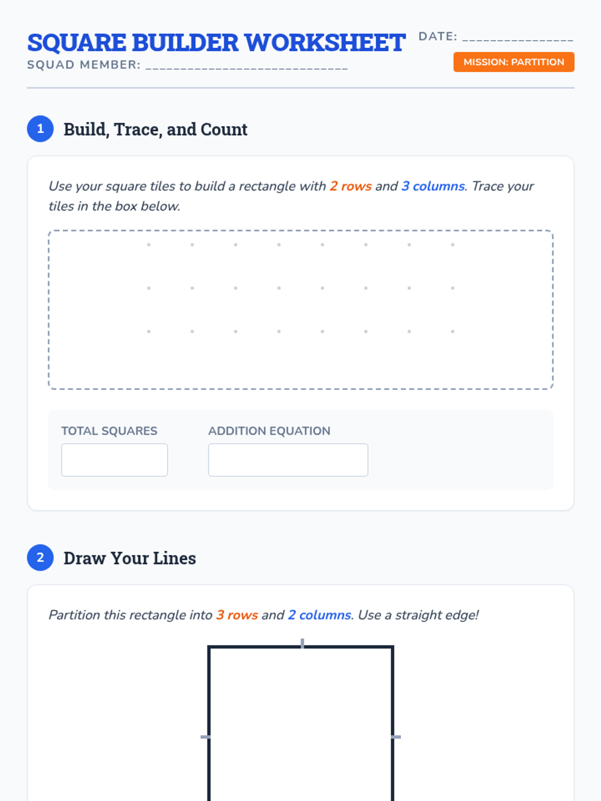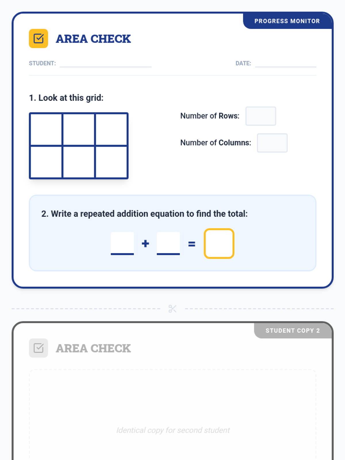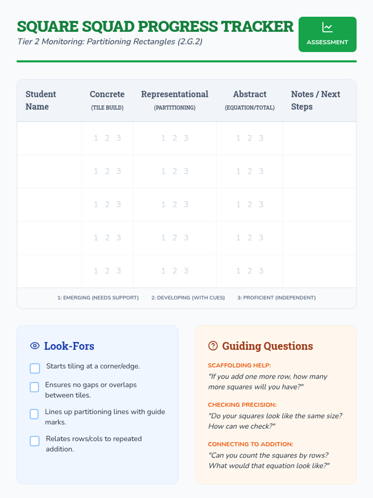 A progress monitoring and assessment tool for teachers to track student mastery of partitioning rectangles. Includes a data tracker, observational checklist, and a quick individual assessment (exit ticket).